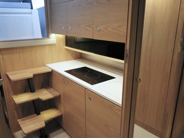 El espacio principal de los interiores se destina a una cocina completa que ocupa la banda de babor, y a un gabinete independiente destinado a un aseo completo, con inodoro, lavabo y ducha. En general no faltan armarios ni espacios para estiba, pero tampoco el astillero ha querido apurar los rincones del barco con interminables huecos inútiles.