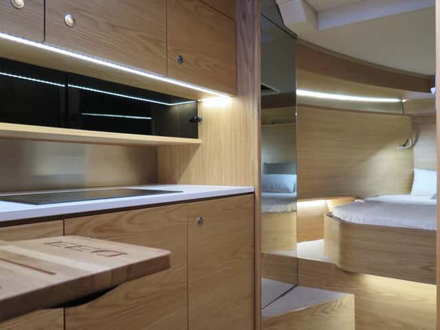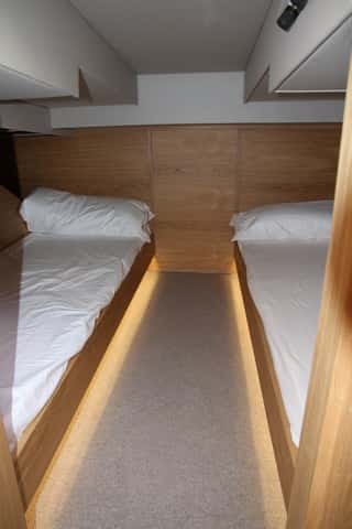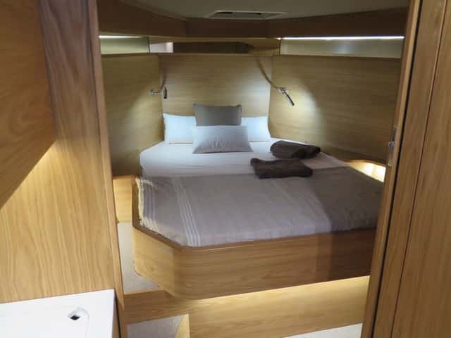 En los interiores el astillero ha optado por prescindir de la dinete clásica a proa, con frecuencia aburrida y poco útil en un barco de este estilo y programa, donde debe predominar la vida a bordo en el exterior. El triángulo delantero, pues, se ha ocupado con una cabina que se aísla mediante una puerta corredera. Es un camarote es sobrio, sin el menor barroquismo en la decoración, con el predominio de la madera clara, de líneas sobrias y con la iluminación artificial que juega con la indirecta a ras de suelo y los puntos de luz de lectura. A este camarote se suma el de popa, con dos literas a lo largo de la eslora, ubicadas bajo el puesto de gobierno, a media eslora del barco. Este espacio llama la atención por su altura en el centro que se consigue por una elevación en la parte central, coincidiendo con el suelo sobreelevado del puesto de gobierno.