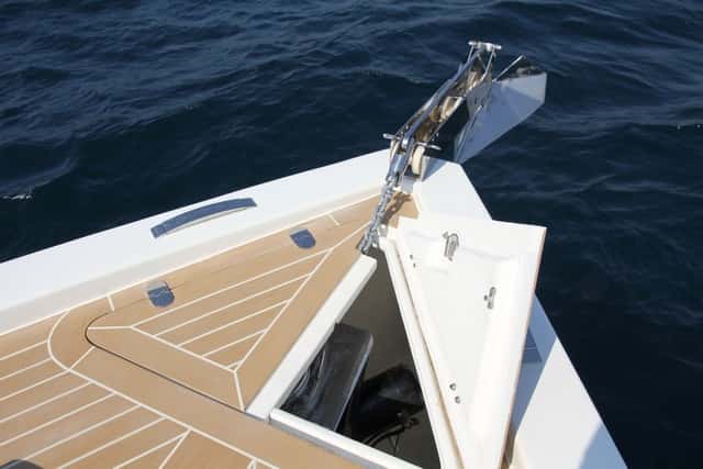 Los pasos laterales llevan a la plataforma de baño, que esta al mismo nivel. La ducha y la escala escamoteada completan el conjunto. La proa, elevada para dar volumen a la cabina, presenta una maniobra de fondeo bien dimensionada, con el ancla de inox colgada.
