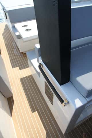 El aspecto general es elegante, con detalles como las cornamusas retráctiles, con el nombre de la marca serigrafiado, o los pasamanos a ambos lados del solárium de popa con recubrimiento de piel.