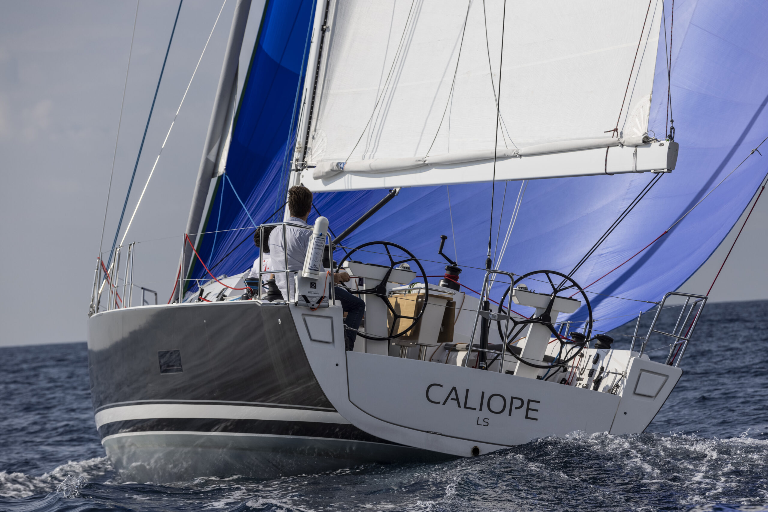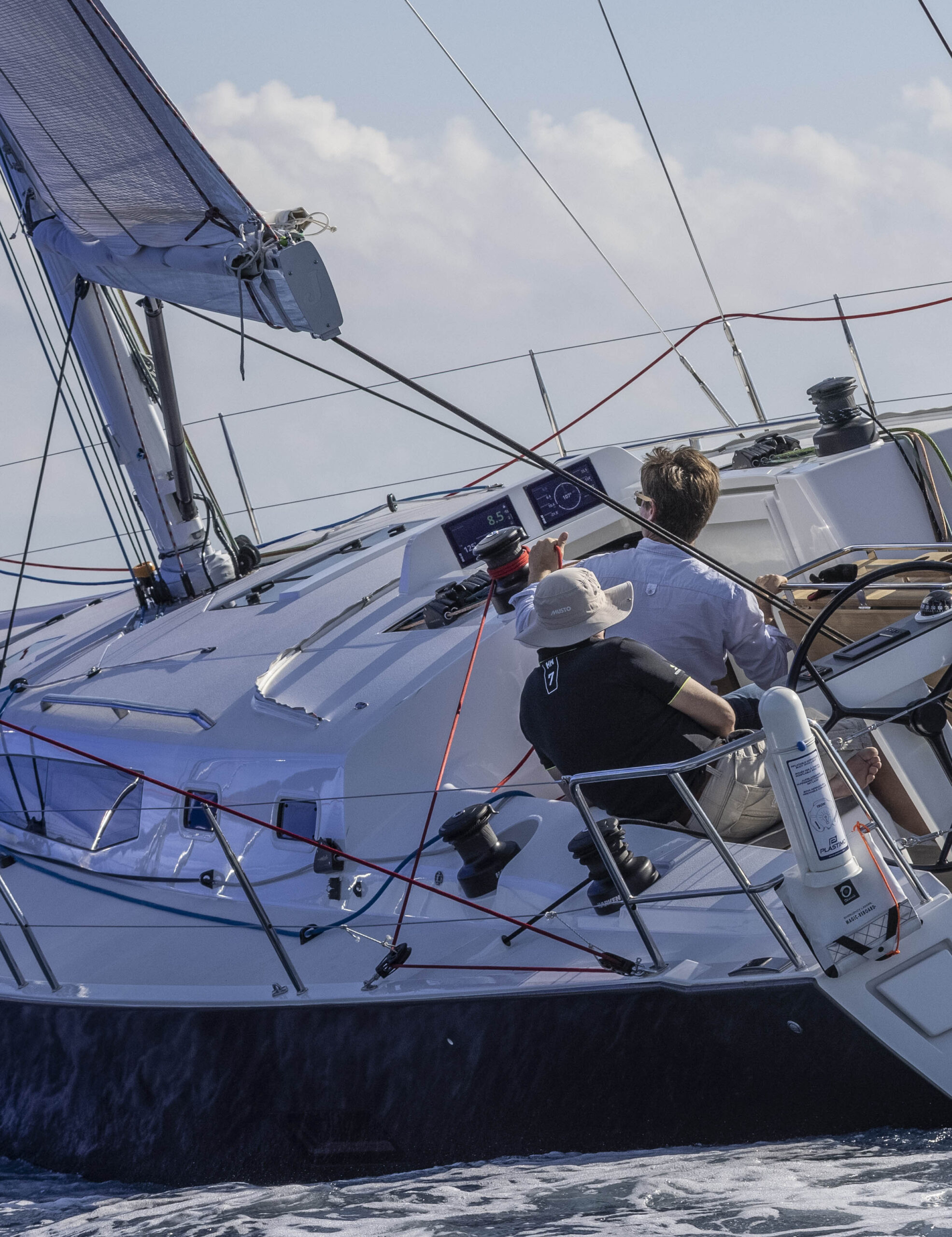 La unidad en que navegamos en aguas de Port Ginesta era la primera que salía del astillero. Estaba dotada con palo de carbono estándar alto, botalón de carbono, obenques rígidos, back hidráulico y contaba con seis winches, los dos de piano en el tejadillo a ambos lados del tambucho y los primarios y secundarios. Y por supuesto, doble rueda con sus correspondientes consolas de repetidores y el carril de escota de mayor en el plan, como no podía ser de otra manera. Las velas, Incidence de membrana D4, y un ropero completo que incluía gennaquer y Código 0. Una configuración completa para disfrutar y sacarle el máximo rendimiento posible, a la que hay que añadir el arraigo de trinqueta con driza bloqueable.