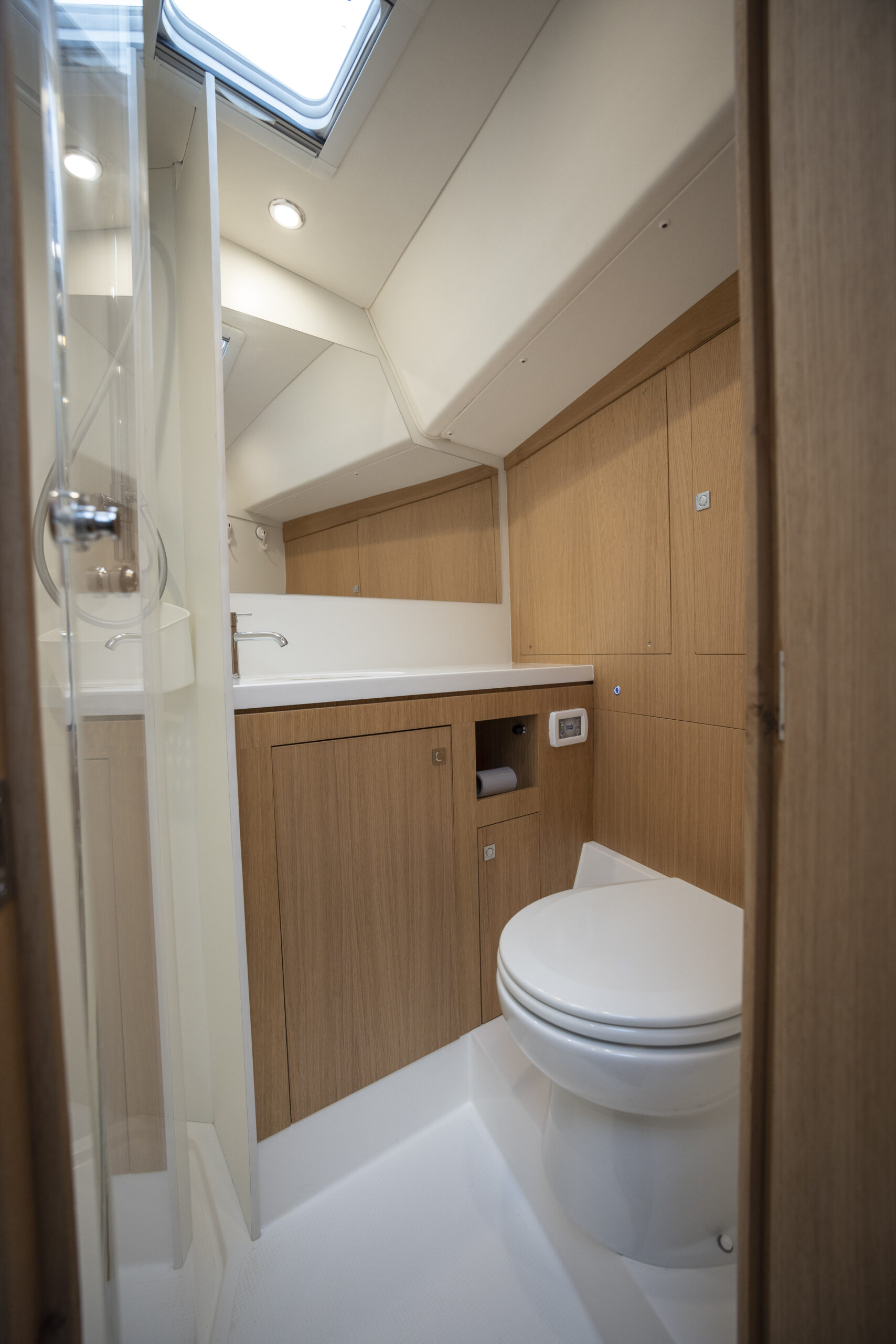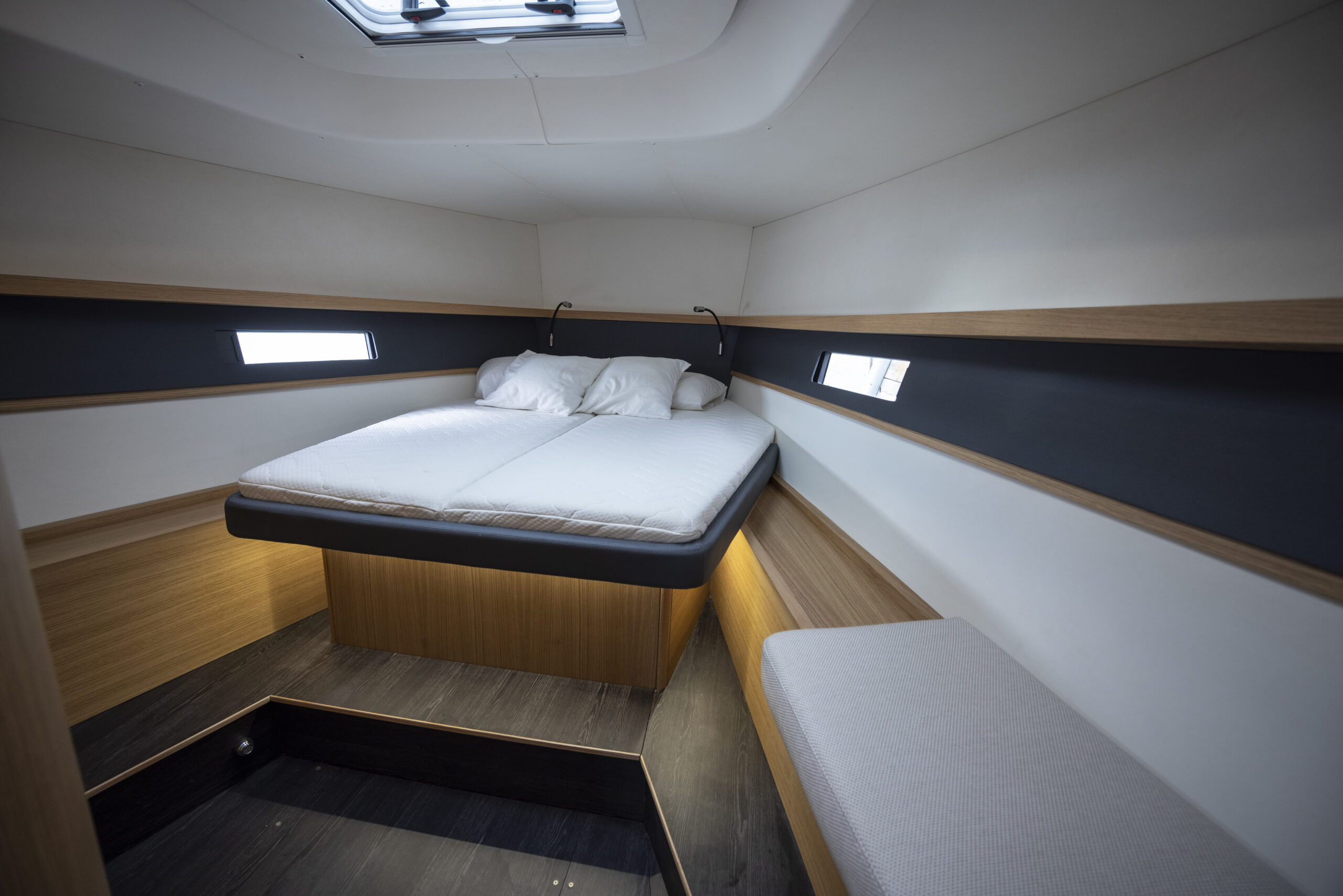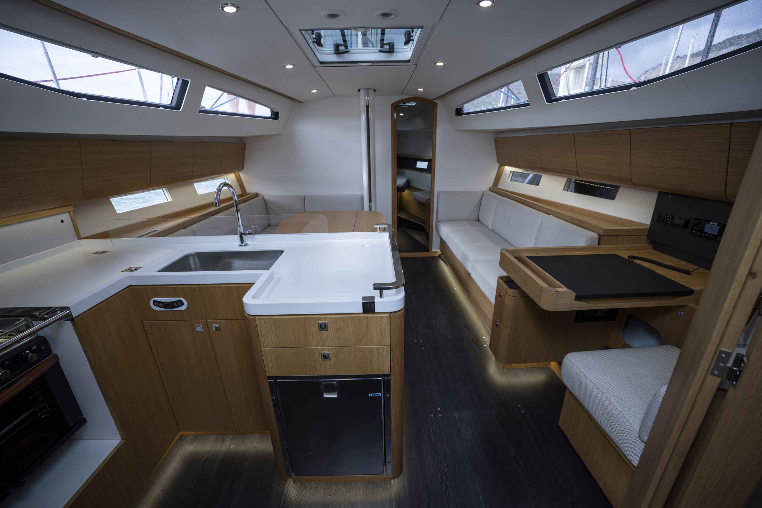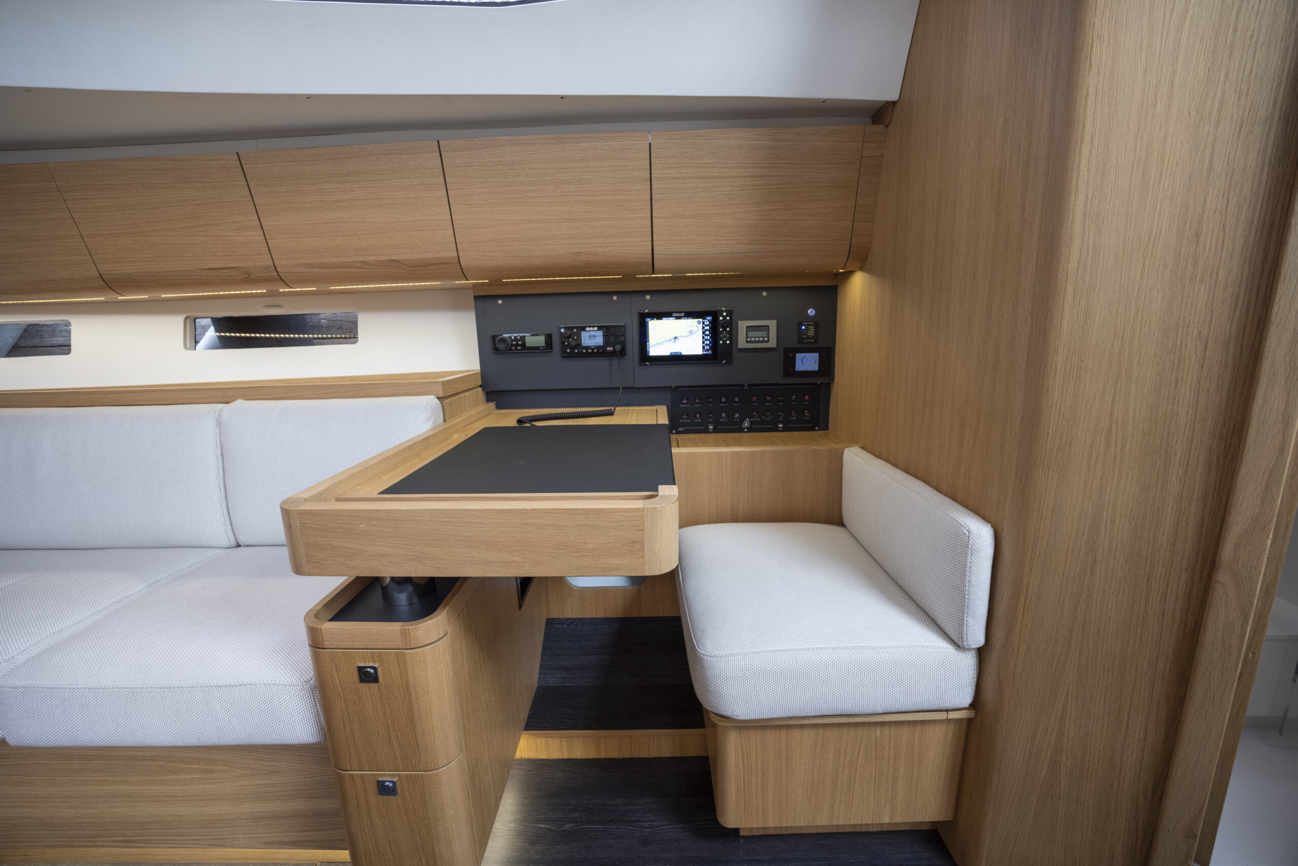 El astillero ha encargado a Isabelle Racoupeau la creación de un interior del barco que responda al doble concepto de barco rápido usable en regata cuando se requiera —en el que la funcionalidad seria el único criterio director— pero que también ofrezca la sensación real de que uno se encuentra en un crucero habitable y cómodo. Y la diseñadora lo ha logrado con elegancia, combinando el plan oscuro —a nuestro gusto con excesiva tornillería— con la madera en las bandas y el mobiliario y el resto del volumen blanco, sin cargar las tintas en accesorios poco funcionales que puedan estorbar. Nada es sobrero y todo está bien dimensionado: el paso central es amplio y hay altura interior, con pasamanos escamoteados en el techo, cocina en L ampliada también circundada con sólidos pasamanos y pantalla de metacrilato de separación con el salón, una mesa de cartas como debe ser en un barco en el que se navegará en crucero, sofás cómodos y con asiento ancho y repisa posterior, cofres altos todo a lo largo de las bandas… Y todo ello en un entorno de mucha luz natural gracias no solo a las ventanas de la caseta y la escotilla del tejadillo sino al añadido de las ventanas del casco que, además de luz, proporcionan vistas sobre el mar y el entorno incluso sentados.