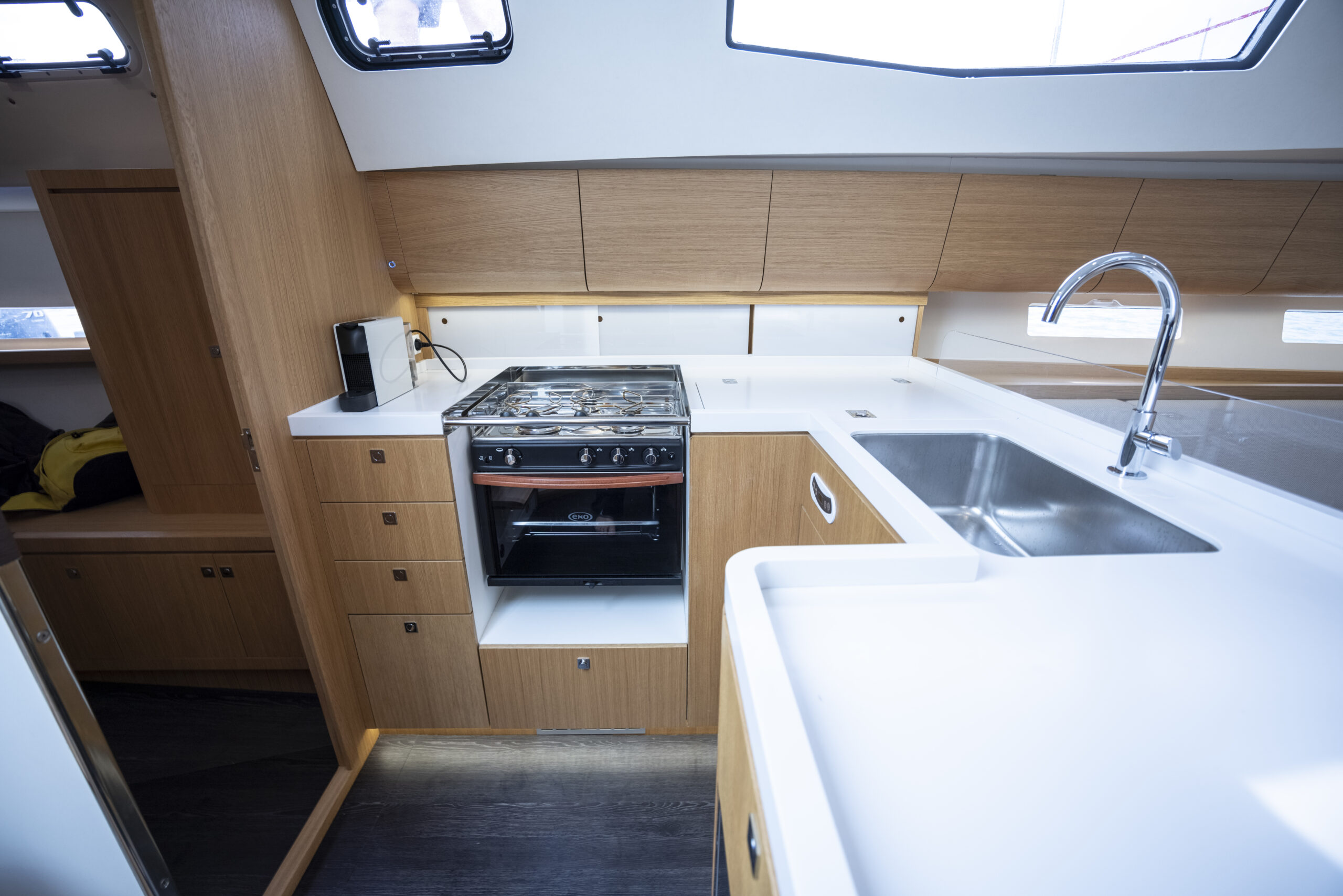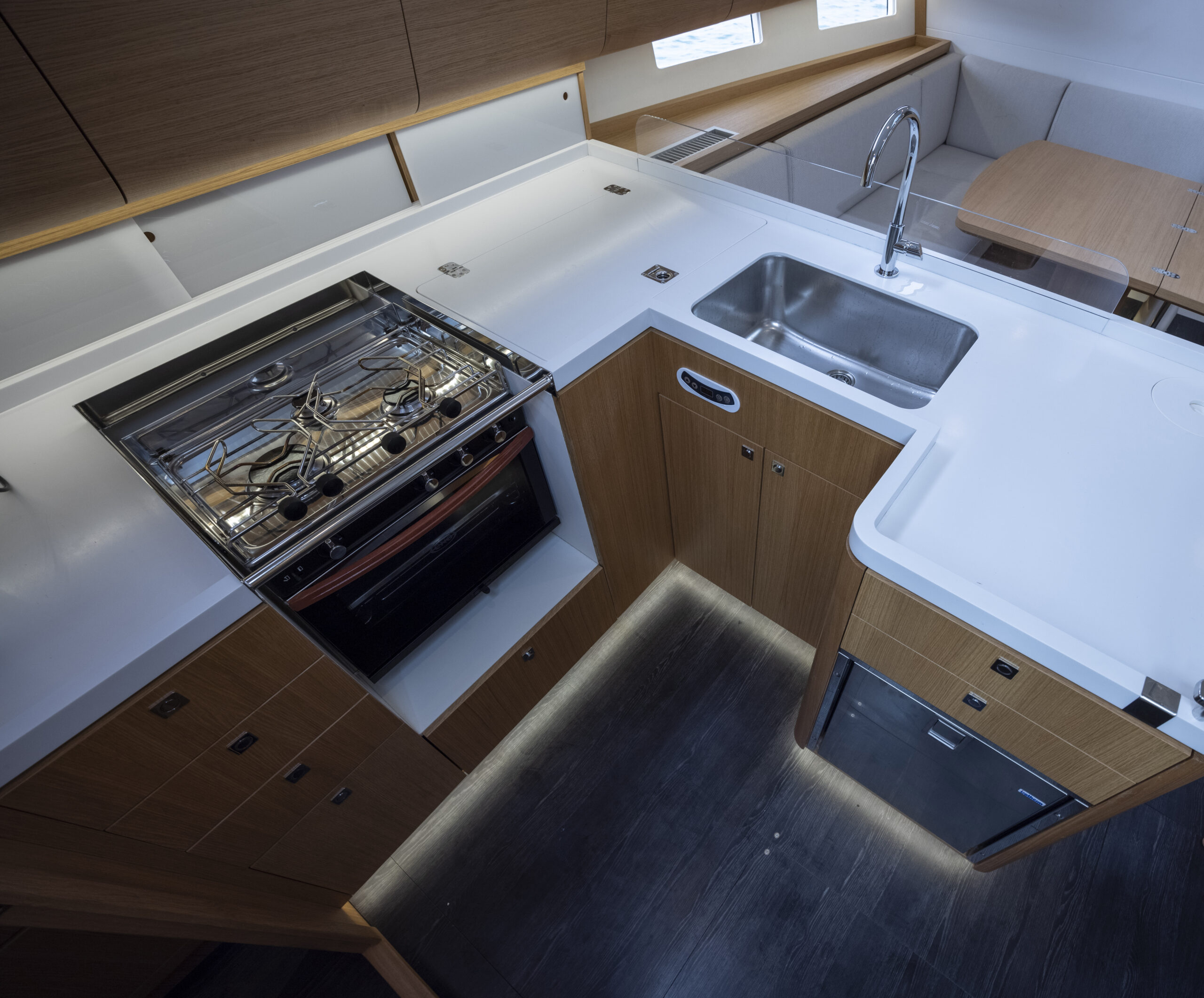 También la cocina refuerza el concepto de crucero para navegaciones largas en aguas abiertas, con sus neveras de apertura frontal y superior, cajones bajos y altos siguiendo la fluidez de líneas del resto de los del salón y una superficie de trabajo grande con guardamares altos integrados.