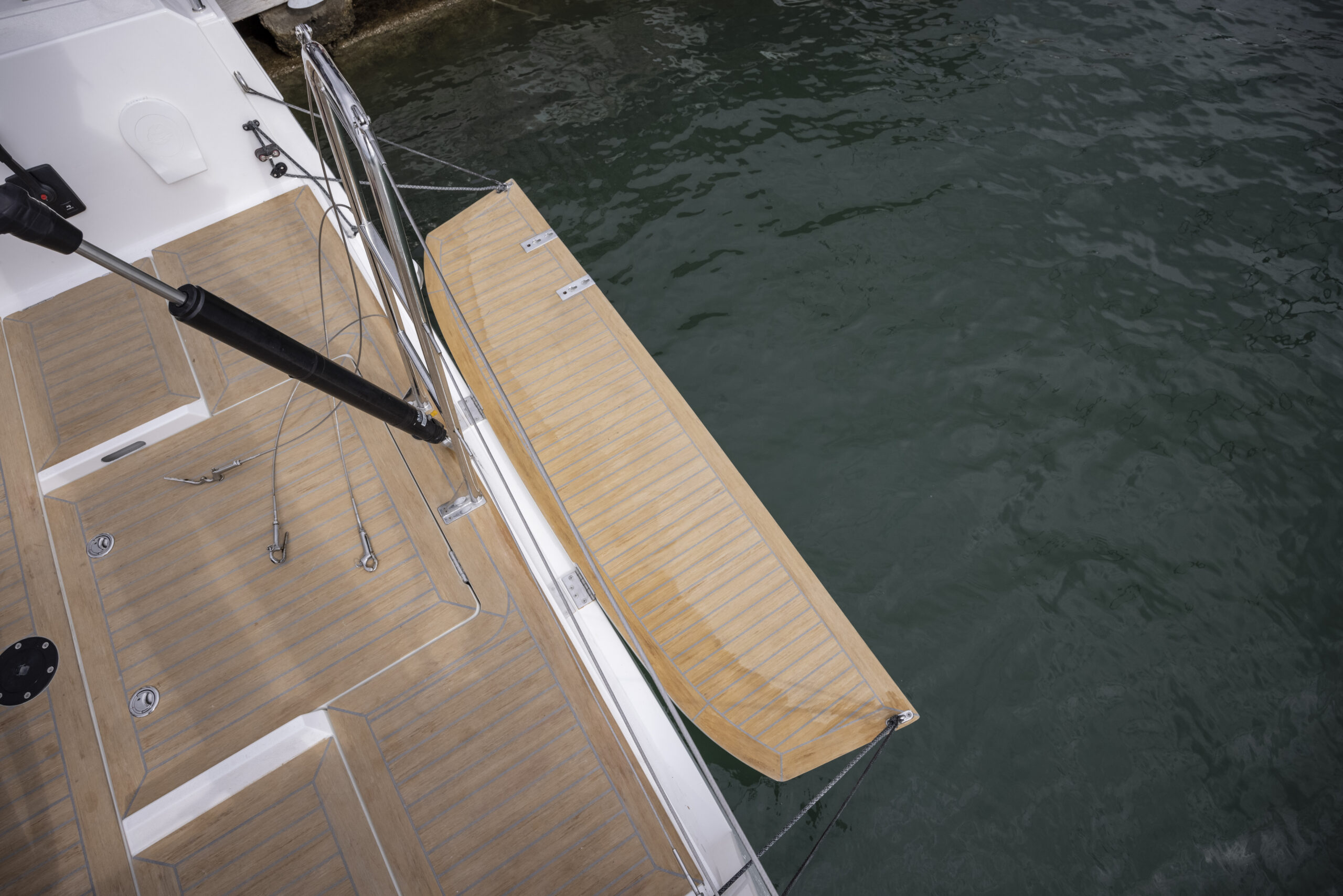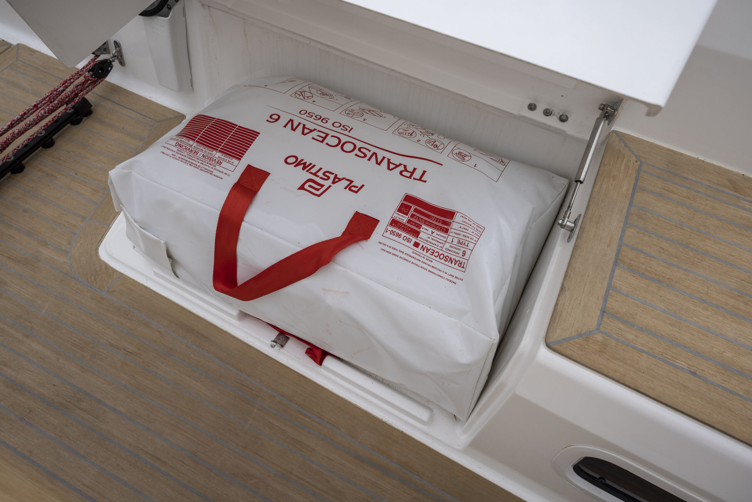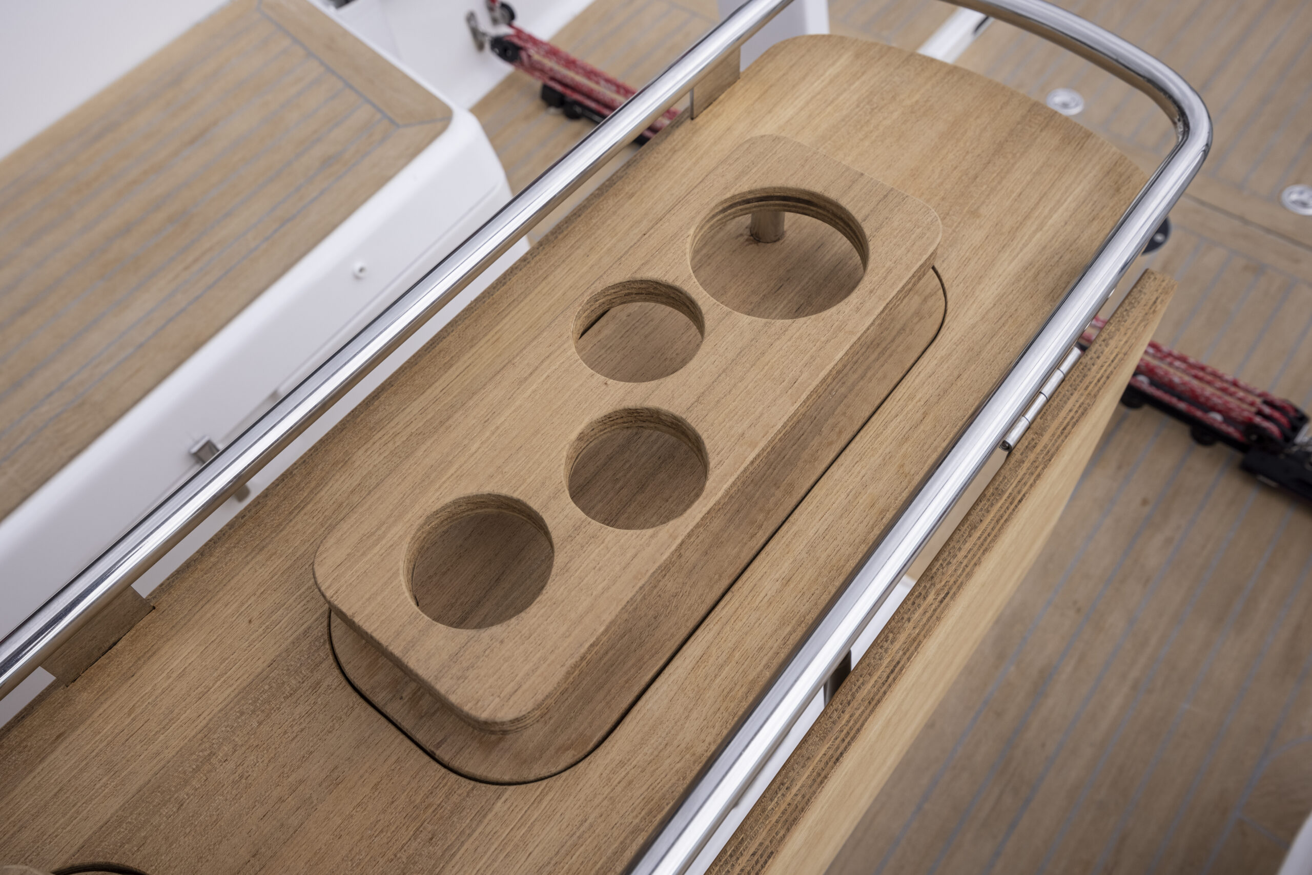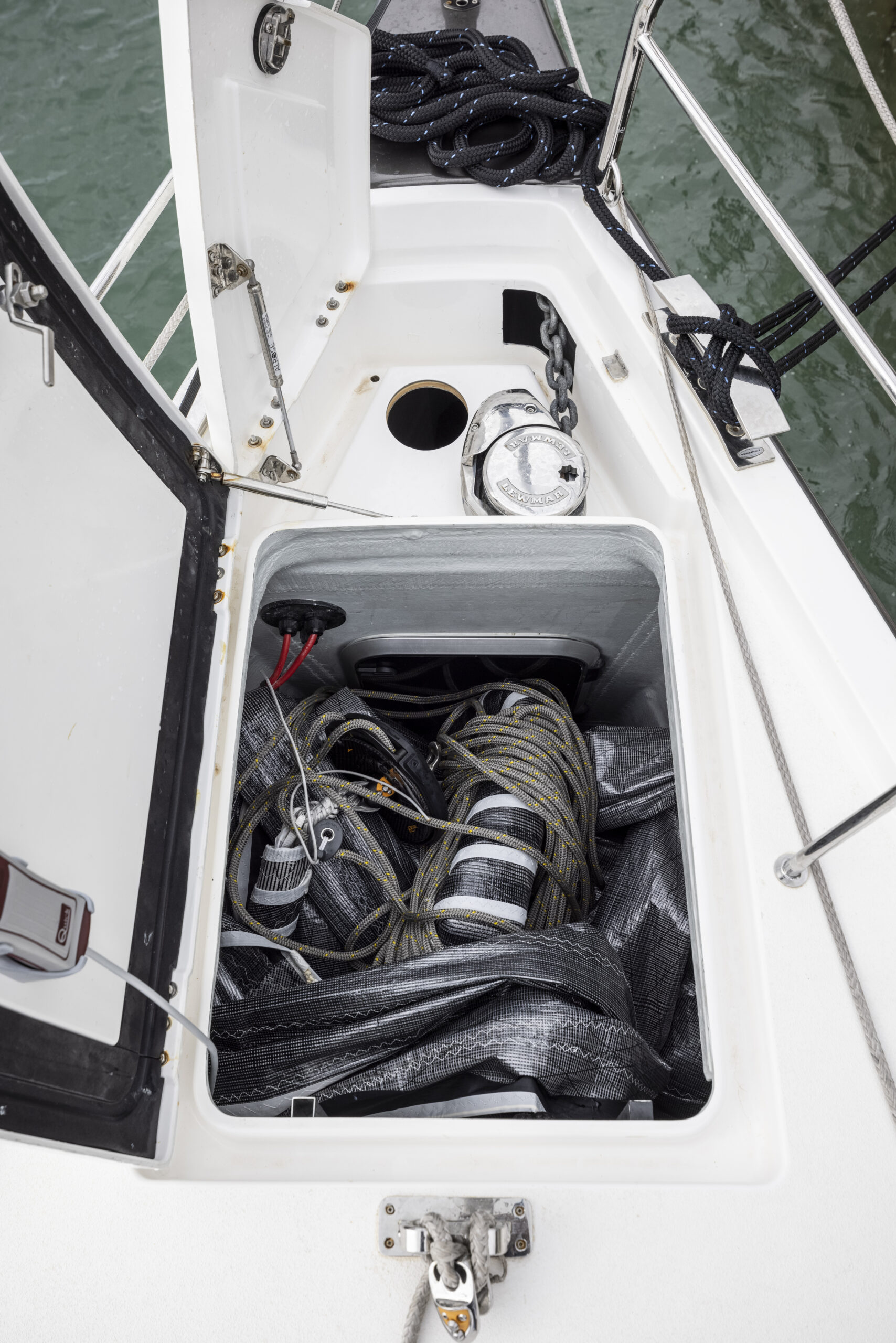 Por lo demás, todo en su sitio. Las escotas de la vela de proa corren bajo cubierta y solo emergen a la altura del winche dejando los pasos de las bandas despejados. Además, a pie de tambucho, un cofre permite guardar los cabos, lo que despeja el plan de la bañera y lo libera de los típicos y molestos spaghettis. En suma, una bañera limpia, ergonómica y capaz, con una mesa central real y robusta, a lo que hay que añadir el paso a popa entre las ruedas amplio y con un soporte central de inox al que se fijan los guardamancebos que sin duda se agradecerá en navegación de crucero.