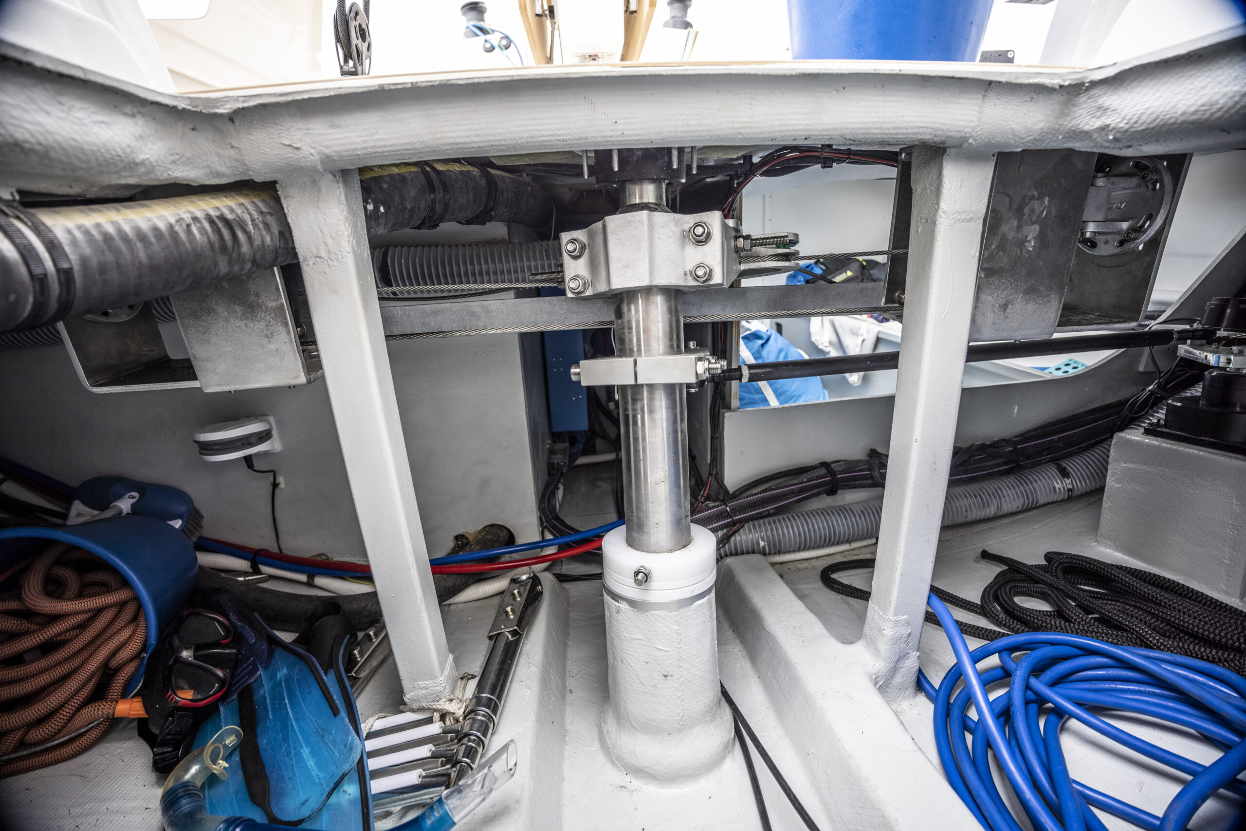 La unidad en que navegamos ofrecía dos cabinas y dos baños y un pañol con puerta que era accesible también desde la bañera, abierto hacia popa y desde el cual se podía alcanzar la zona de popa con el sector, el eje del timón y el piloto automático.