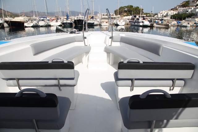 Navegamos esta Quer por las aguas de Cap de Creus bajo unas condiciones de mar y viento muy favorables. Lo más destacable en la navegación de este barco es su capacidad de planeo, agarre en virajes cerrados y suavidad en el gobierno. Los mandos electrónicos de los dos Suzuki de 300 Hp —la máxima potencia homologada, aunque pueden ser suficientes dos de 250 Hp— tienen una gran respuesta. Con el gas a fondo alcanzamos los 48 nudos a 6.200 rpm, y para mantener un crucero bastan los 24 nudos a 3.500 rpm. Es un barco sensible al trimado de los motores y para la maniobra se ve ayudado por la hélice de proa, muy útil en este barco.