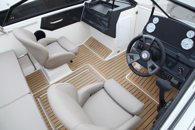 En este modelo se agradecen los mandos electrónicos, el sistema Active Trim y la ergonomía que ofrece el puesto de gobierno. Un barco para divertirse a fondo, que cumple adecuadamente con el programa de un modelo familiar, polivalente, como con el de una pequeña lancha, rápida y segura.