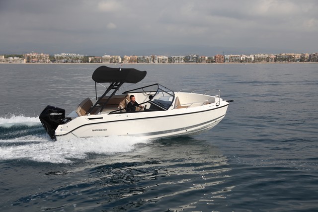 En cuanto a la navegación, disfrutamos de la potencia del Mercury de 115 Hp, potencia más que suficiente para lanzar este barco por encima d ellos 36 nudos de punta. Para mantener un régimen de crucero cómodo, con un consumo moderado, bastan los 24 nudos a 3.800 rpm. A este régimen el consumo está en 0,94 litros por millas, y el barco ofrece una autonomía superior a las 160 millas. Carena bien resuelta, buena navegante, dotada de buena potencia y del sistema Activ Trim de trimado automático, lo que facilita la navegación y optimiza el rendimiento y el consumo. Modelo muy adecuado para la iniciación a la náutica de recreo, con las ventajas, como las demás Quicksilver, de ofrecerse en pack, lo que viene a suponer un ahorro de un 10% o más.