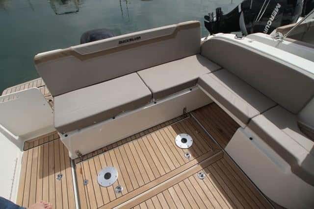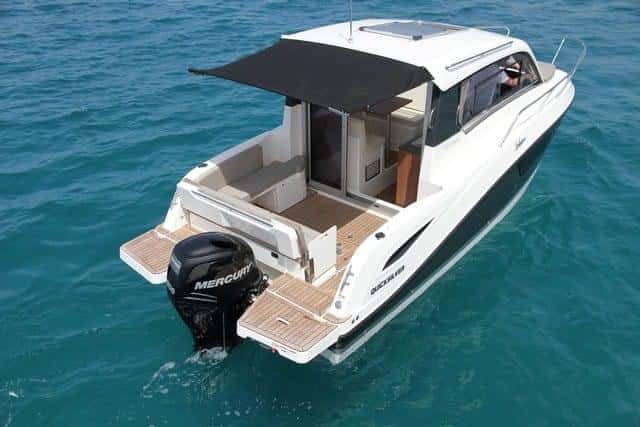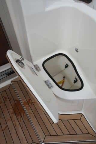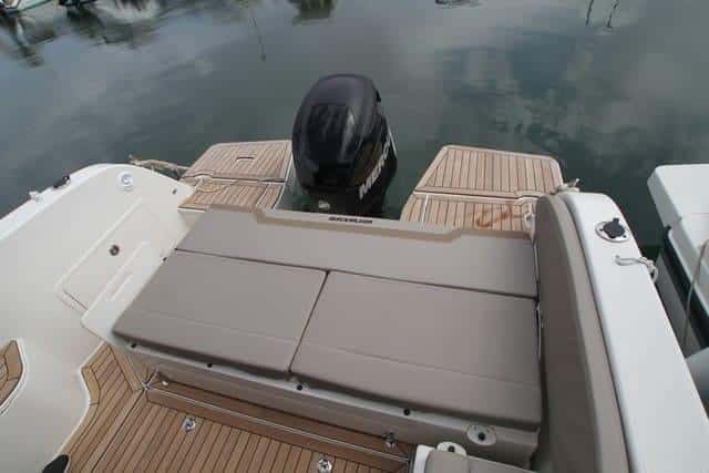 La posibilidad de contar con un acceso directo a la plataforma de baño por la banda de estribor, y de poder desplazar el asiento de popa hacia delante mediante raíles (para poder levantar totalmente el motor fueraborda y sacar la hélice del agua), incrementan las posibilidades de este espacio al aire libre.