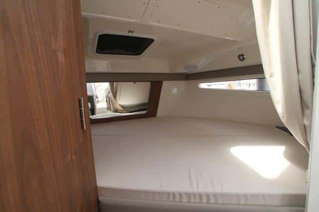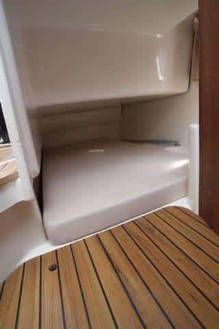 La zona privada de proa cuenta con dos espacios para dormir, la cabina delantera, espaciosa, con portillos laterales y cofres en la parte inferior; en la banda de babor, a lo largo, tenemos una segunda litera individual, para niños, con una longitud de 1,60 metros que, en todo caso, puede servir como un excelente espacio de estiba. Completa este espacio de proa un gabinete de aseo independiente, con inodoro