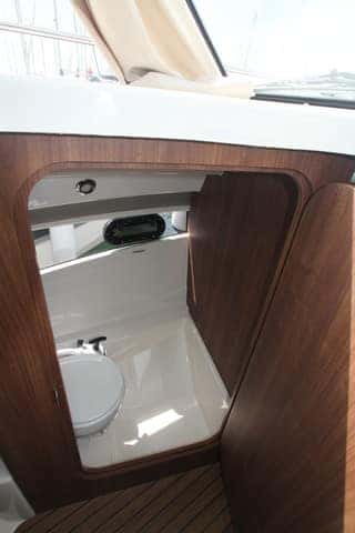 La cocina es otro elemento importante en este barco. Situada en la banda de estribor, tras el asiento del piloto, el mueble acoger un fogón a gas, nevera en la parte inferior y fregadero con su tapa, además de contar con cajones y un armario. Su ubicación junto a la entrada permite ofrecer servicio tanto a la dinete del interior como a la de la bañera. Hemos de recordar, sin embargo, que la cocina a gas y la nevera son opcionales, aunque el conjunto está muy bien concebido, tanto por sus dimensiones como por su diseño.