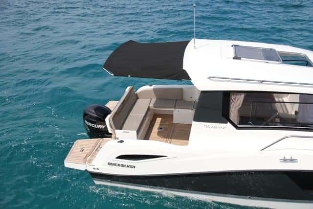 La Quicksilver Activ 755 Weekend ha reemplazado a la anterior 705 Cruiser, un barco que ha tenido un éxito importante en sus años de existencia. Ahora esta eslora de 7 metros —que cubre el catálogo de las Activ con la 855 Weekend— viene a ofrecer unas prestaciones de habitabilidad sorprendentes, tanto en la espaciosa cabina como en la bañera, un espacio que propone varias opciones, con un sofá en popa que se desliza mediante carriles.