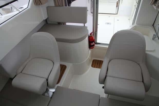 Además de la funcionalidad, hay dos aspectos destacables en este modelo: la seguridad y la comodidad. Por una parte se ha diseñado un alto francobordo con gran protección de la bañera, plataformas de baño con puerta y una visibilidad total desde le puesto interior. Y por la otra destaca el confort, con una total ergonomía en la bañera, muy preparada para la pesca, y unos interiores amplios y luminosos. Aquí también el paso de estribor es más ancho que el de babor.