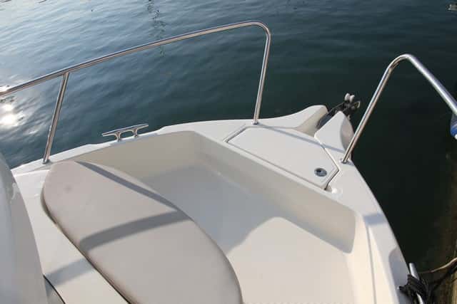 Al equilibrio de la distribución de la cubierta debemos tener en cuenta la calidad de los herrajes, tanto de las cornamusas como de las distintas piezas de inox que complementan el barco, así como los robustos asientos laterales (opcionales) de la bañera, y los acabados en fibra, muy cuidados.