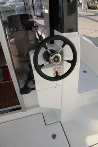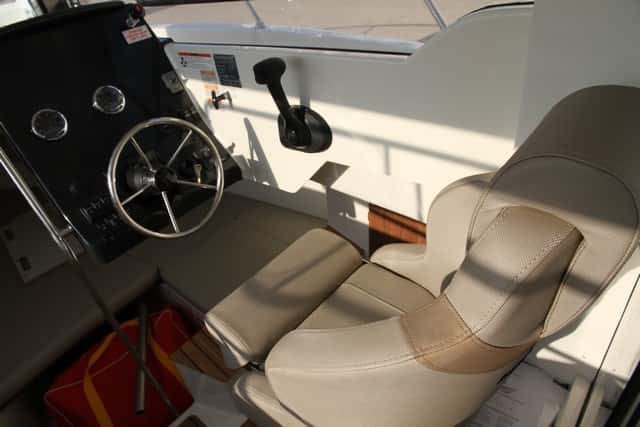 El panel, en fibra oscura, es lo suficientemente grande como para montar una pantalla multifunción (opcional) y los indicadores del Mercury Diesel 2.8 220i, la palanca en el lateral, el volante de inox y los interruptores dispuestos en la parte inferior de la consola rematan este puesto de gobierno. El asiento del piloto es regulable en aproximación, no en altura, y dispone de reposapiés, además de una visión panorámica de 360 grados.