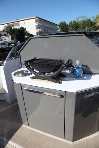 El mueble de cocina, situado tras el puesto de gobierno es otro elemento importante. Se puede configurar según las preferencias, con nevera, fogones a gas o, como en el barco que probamos, con una parrilla independiente, de quita y pon, que resultaba ser mucho más práctica, limpia y funcional. Muchas veces los propietarios aportan soluciones que, si bien no son tan atractivas comercialmente, sí lo son en función de la comodidad.