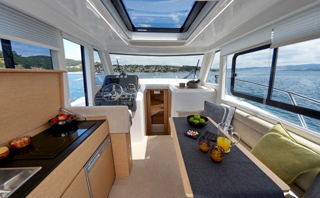Completa este espacio el salón-comedor, con sofá en U en el costado de babor, mesa regulable en altura y convertible en cama. El mobiliario, como en la cocina, es de madera natural, hay cortinas estor en las ventanas laterales y una guantera para estiba en la encimera de estribor, bajo el parabrisas.