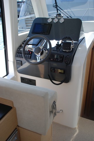 Digamos finalmente que la versión Flybridge dispondrá de acceso desde el exterior mediante escalera de inox, puesto del piloto a babor con asiento doble, arco de radar y asiento en U convertible en solárium.