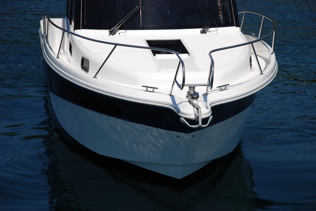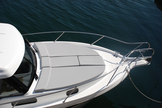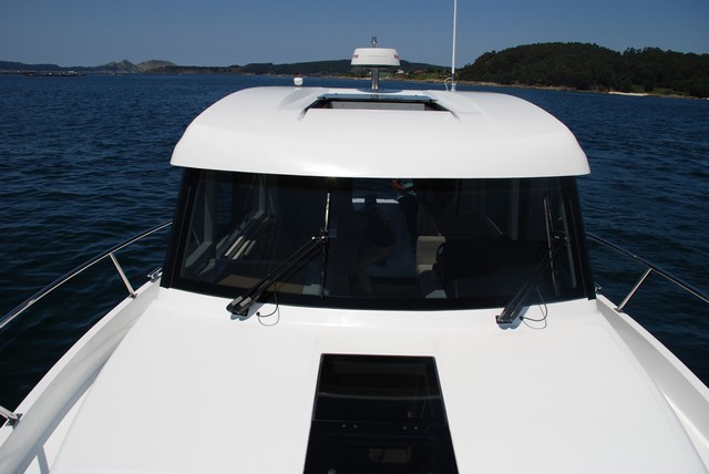 Otros rasgos distintivos respecto al anterior modelo son las ventanas laterales del casco que se prolongan a lo largo del tercio de proa del mismo, los montantes de popa y de proa de la caseta que ahora son oscuros y quedan escondidos tras las cristaleras proporcionando desde el exterior una imagen más moderna y aérea de la superestructura, la escotilla corredera eléctrica en la caseta de la versión Hard-Top en que navegamos, y la capota de sombra que prolonga el alero del techo por popa proporcionando más sombra al espacio de la bañera.