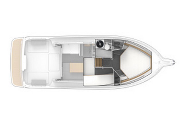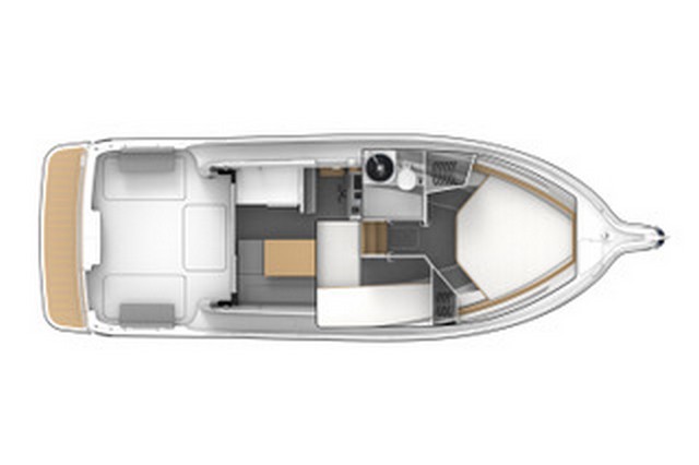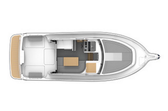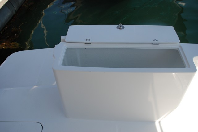 Tampoco los más aficionados a la pesca tendrán queja, ya que, en popa, en crujía e integrado en el espejo, se dispone un cajón con preinstalación para vivero de cebo vivo. En el plan de la bañera encontramos también dos grandes cajones a las bandas para estiba, así como el registro de acceso a los motores.