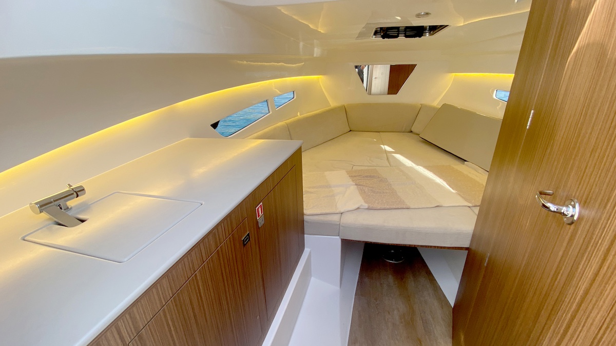 Accediendo desde la entrada situada a babor de la consola de gobierno, el interior de la cabina dispone de espacios de cocina con estiba, sofá en forma de V convertible en cama doble y cabina de aseo independiente a estribor. A popa, tras las escaleras de acceso de acero inoxidable con peldaños de fibra forrados, encontramos un pequeño pero funcional espacio para la estiba de material diverso, como colchonetas, lonas o material de seguridad.