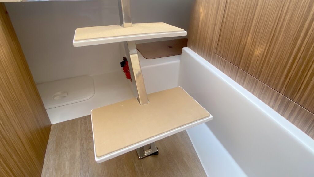 Las soluciones de confort y la experiencia del astillero en la construcción de embarcaciones de recreo pensadas para ofrecer habitabilidad, funcionalidad y seguridad, ya se dejan intuir tan pronto nos embarcamos por la plataforma de baño de la banda de babor, protegida por un pasamanos alto. Un buen punto de agarre tanto para transitar como a la hora de tomar un baño.