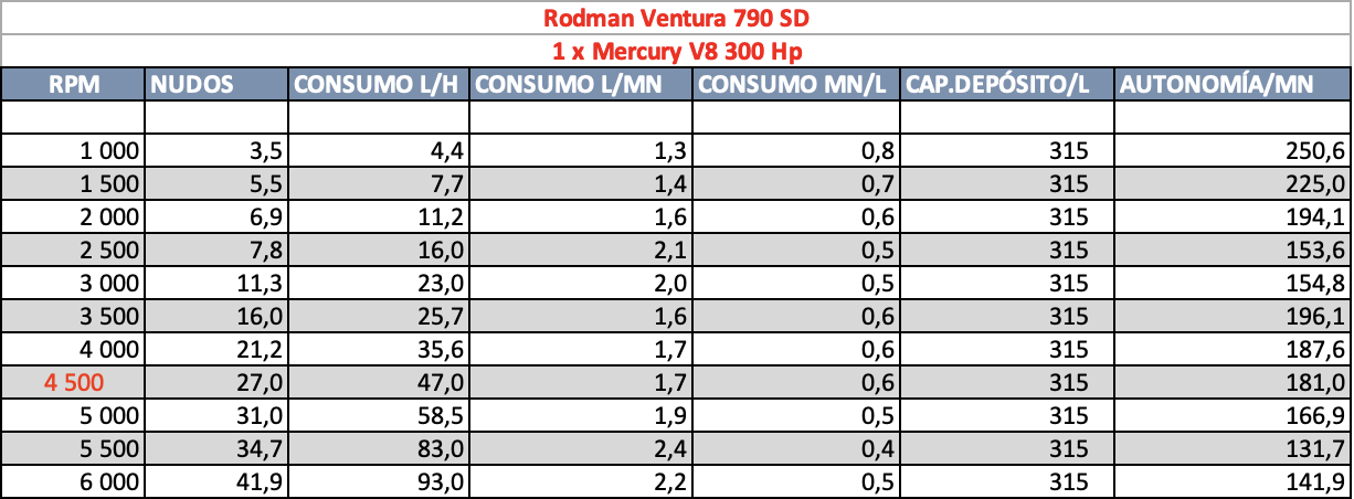 Velocidad de crucero: De 21 a 27 nudos entre 4.000 y 4.500 rpm, con un Mercury Verado V8 de 300 Hp.