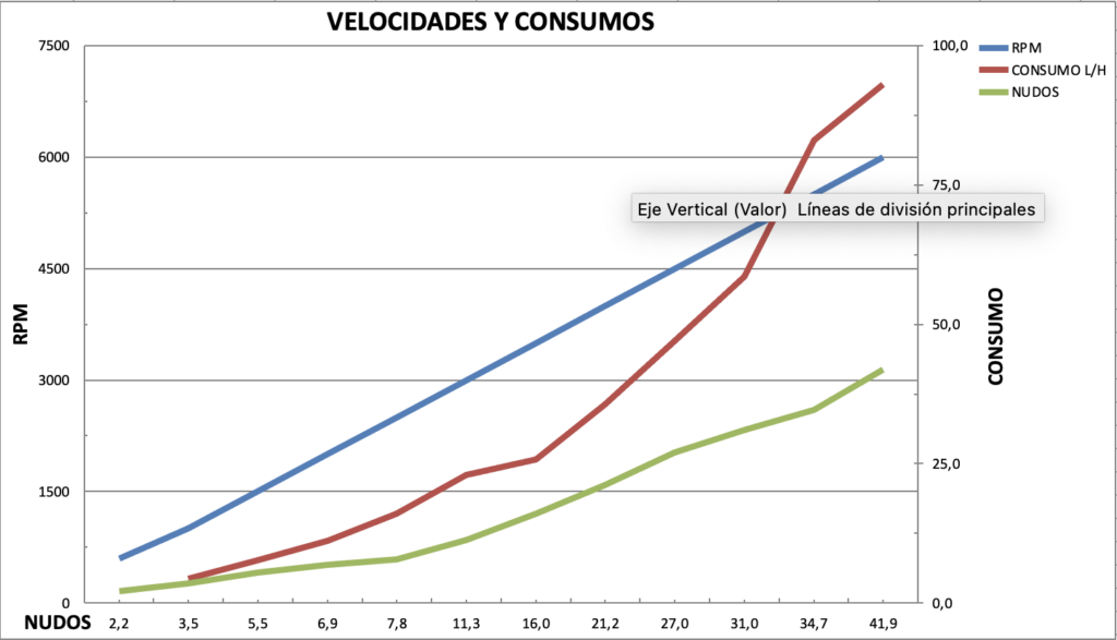 Velocidad máxima: 41,9 nudos a 6.000 rpm.