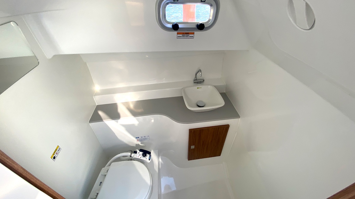 Accediendo desde la entrada situada a babor de la consola de gobierno, el interior de la cabina dispone de espacios de cocina con estiba, sofá en forma de V convertible en cama doble y cabina de aseo independiente a estribor. A popa, tras las escaleras de acceso de acero inoxidable con peldaños de fibra forrados, encontramos un pequeño pero funcional espacio para la estiba de material diverso, como colchonetas, lonas o material de seguridad.