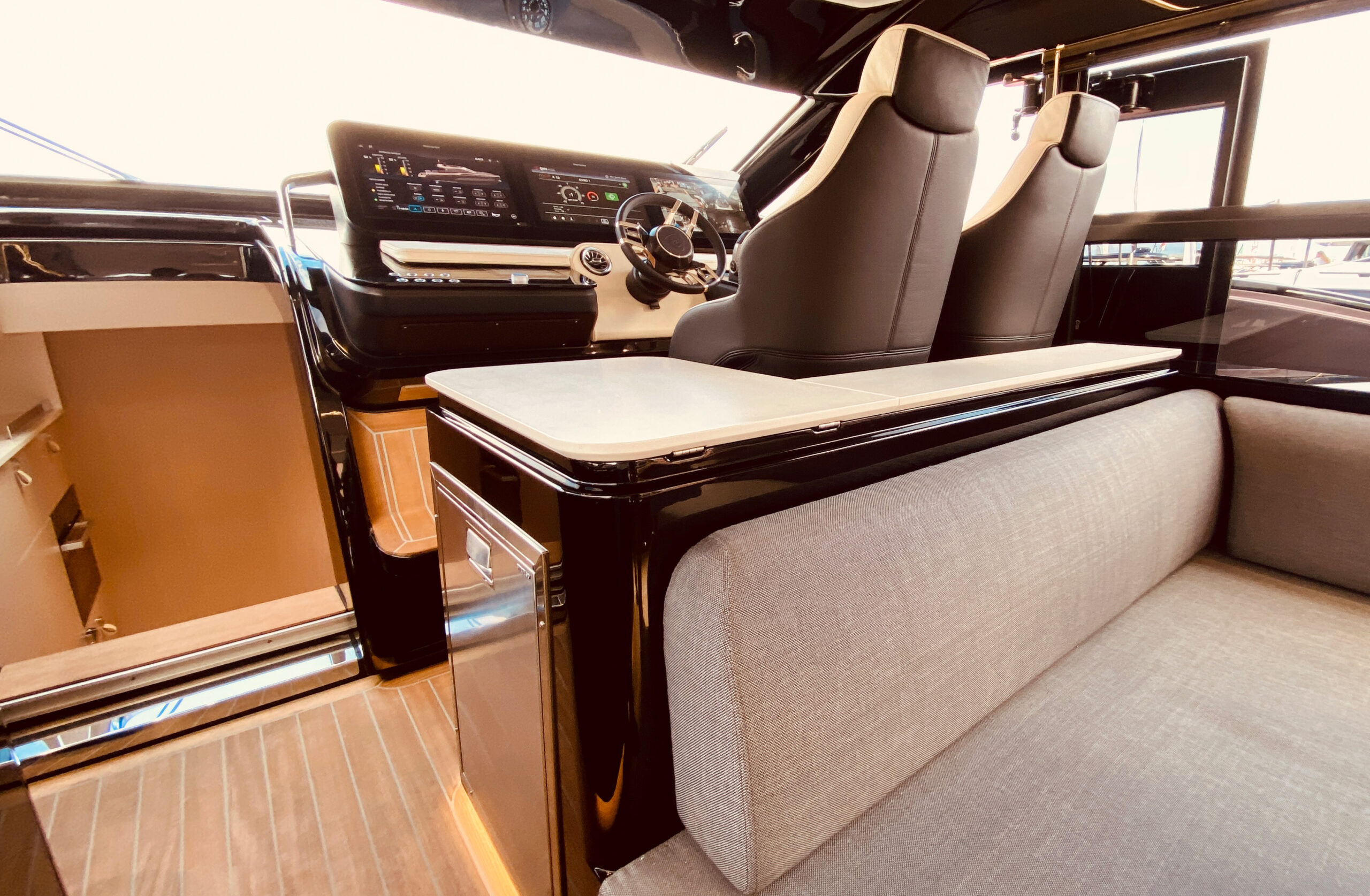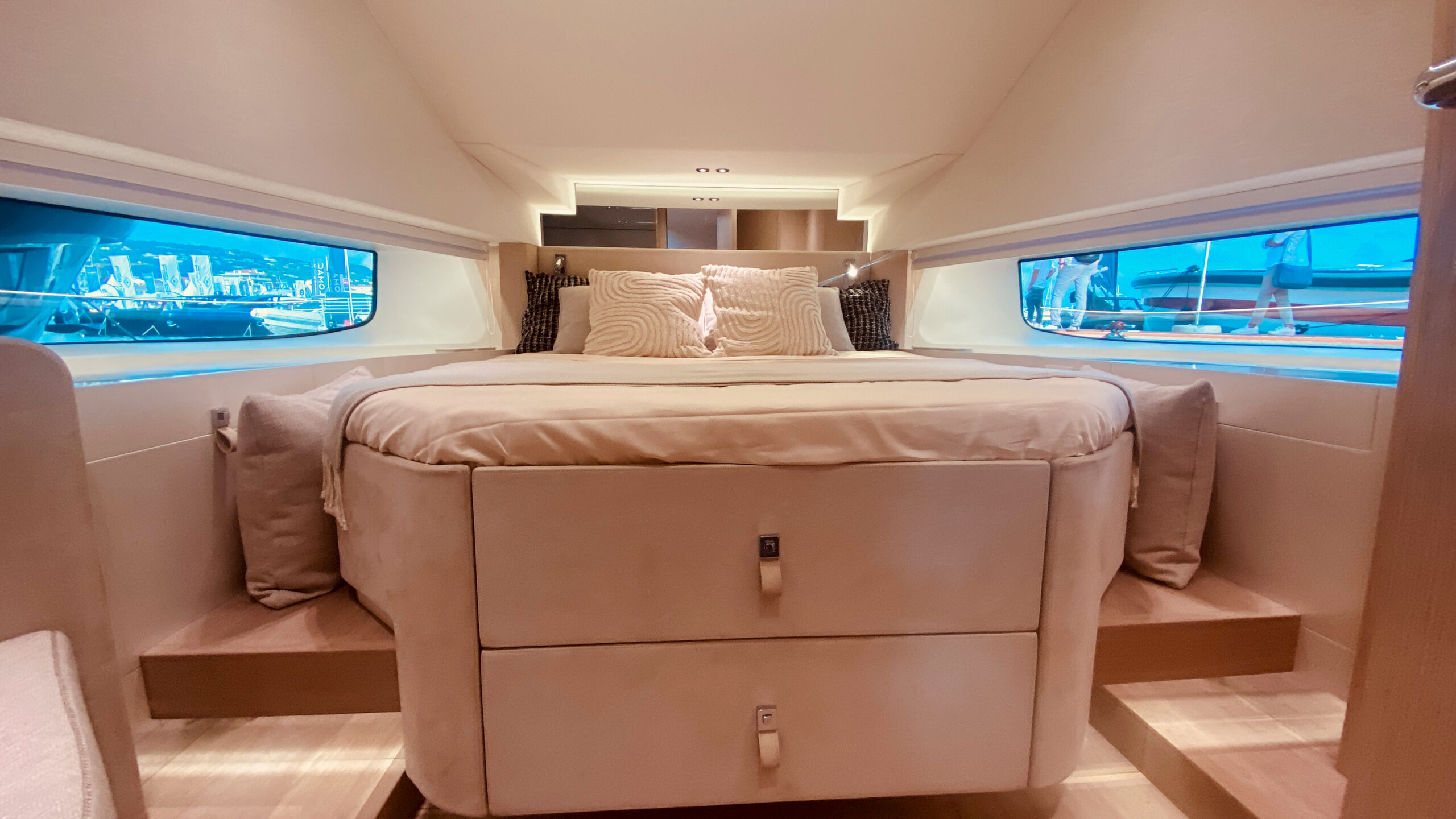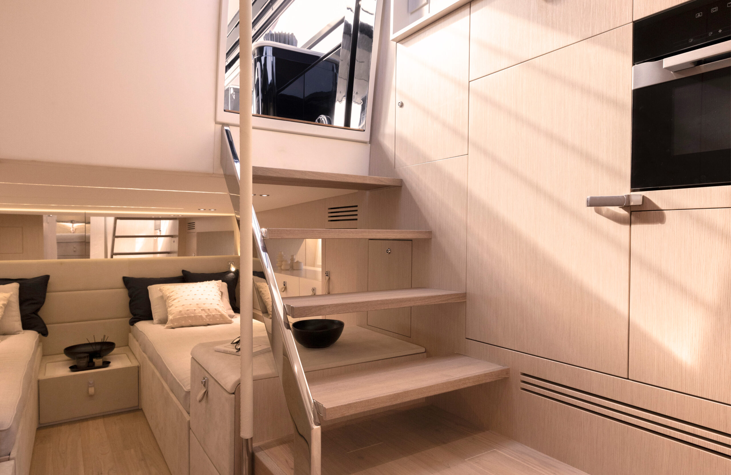 El diseño elegante y exclusivo se mantiene en el interior, así como su funcionalidad y habitabilidad. Se puede escoger entre dos configuraciones distintas, una con camarote VIP a proa y la otra, con un espacioso salón a modo de sala de estar y ocupado por un gran sofá rinconero.