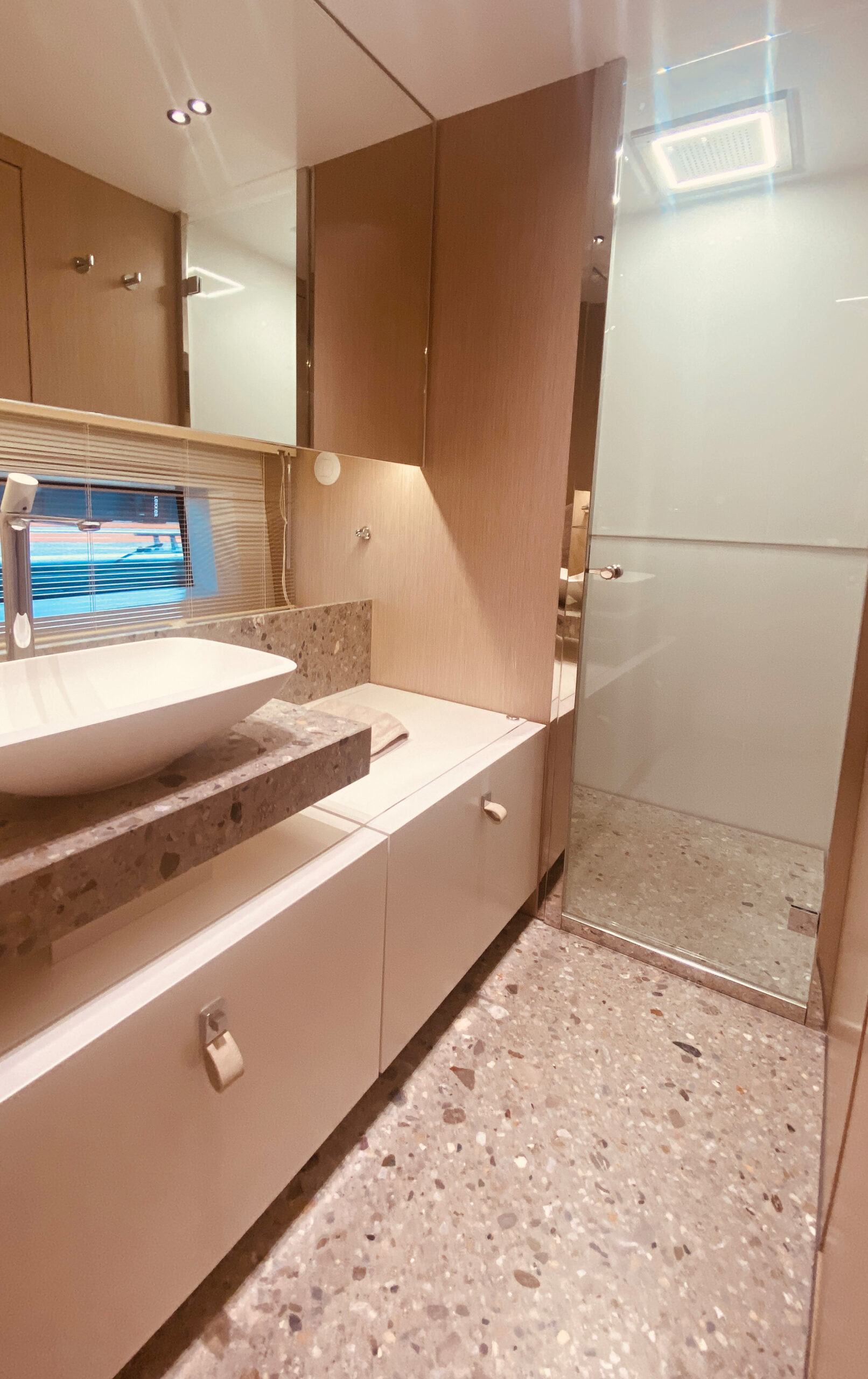 La popa aloja una espaciosa cabina con dos camas individuales y que ocupa toda la manga de la parte central de la embarcación. En el lado de estribor, la cabina de aseo de grandes dimensiones va acorde con la amplitud de espacios y exclusividad que desprenden el resto de todos los espacios de la Rebel 50 G.
