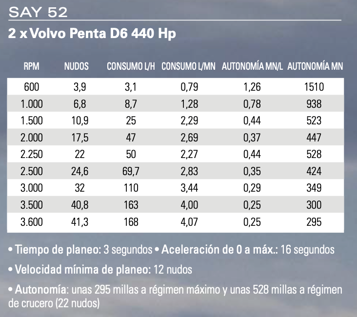 Lo más importante es que, a una velocidad de crucero de 22 nudos, el consumo es de solo 50 litros por hora.
