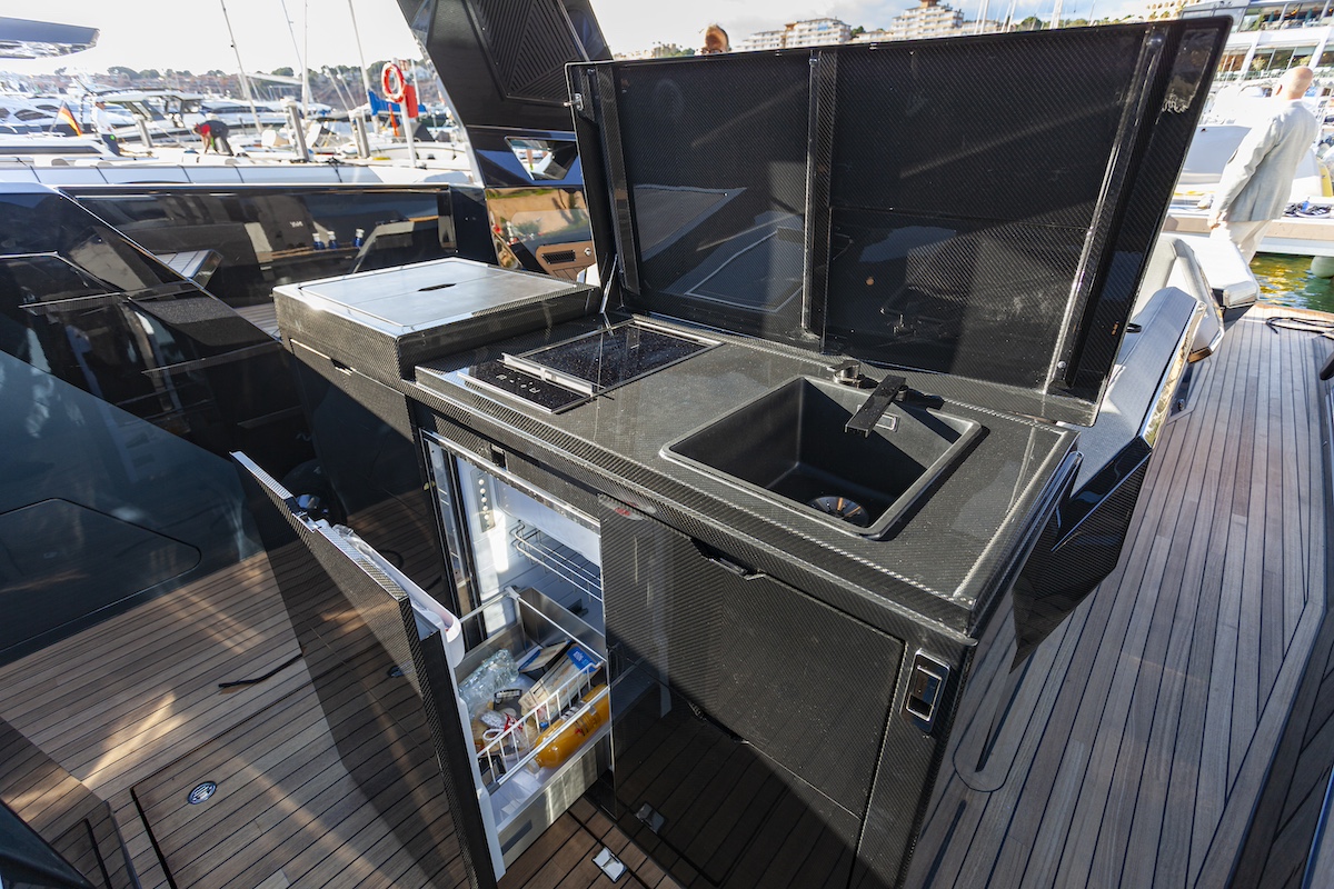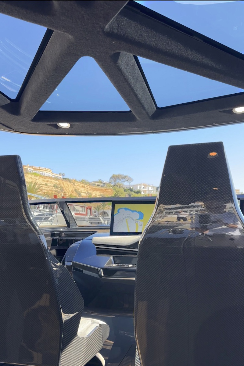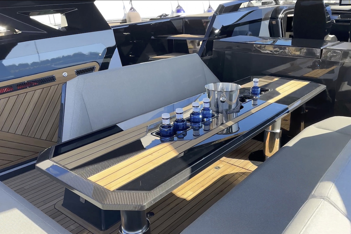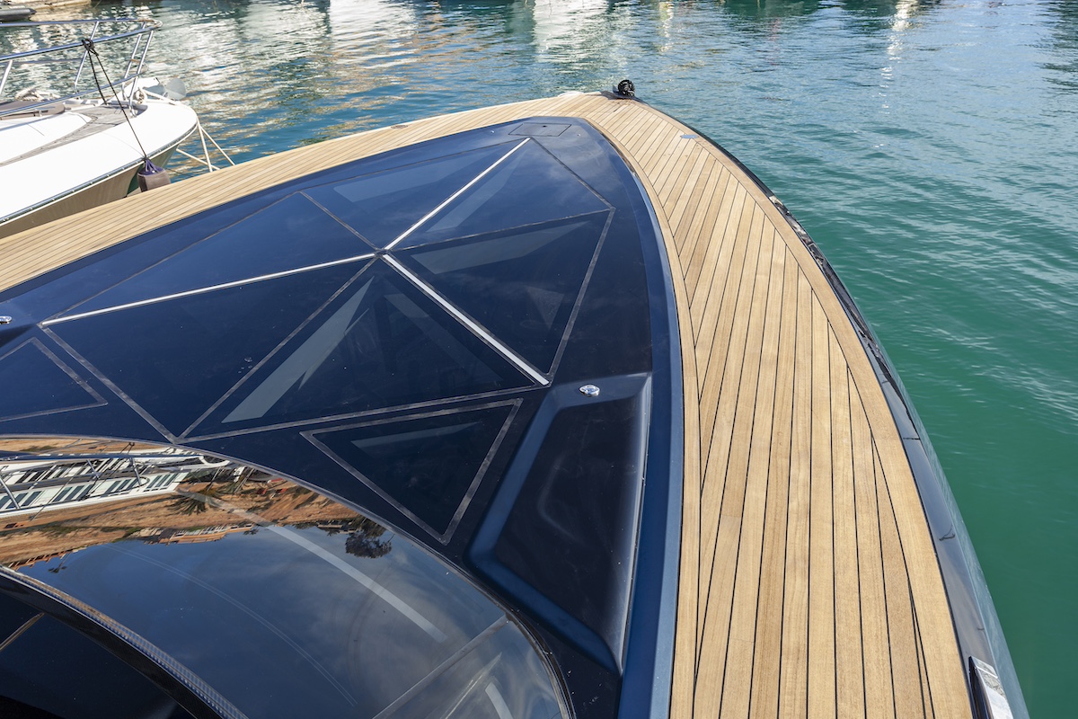 Indudablemente, la influencia de la industria automotriz salta a la vista: líneas agresivas, rectas, ángulos de facetas muy marcadas. Una estética de deportivo que combina a la perfección con la fibra de carbono. Todas las superficies transitables están recubiertas de teca natural. Esta unidad ya tiene propietario, quien ha escogido varias de las opciones, como la teca natural o los tapizados. En general, el nivel de personalización es muy alto.