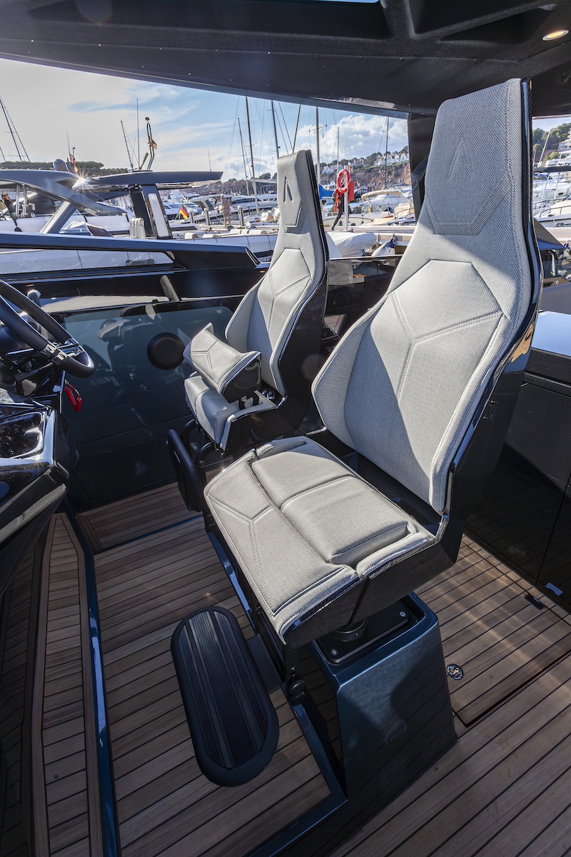 Seguidamente encontramos dos asientos equipados con sistema de amortiguación Shockwave S6 de altura regulable. El puesto de gobierno está muy despejado; solo destaca el mando del motor y el joystick a estribor, y el control del Seakeeper a babor. El resto son pantallas táctiles: dos de ellas en la parte superior, separadas para dejar la visión central libre a quien esté al mando. El salpicadero recuerda al de un coche de alta gama de última generación.