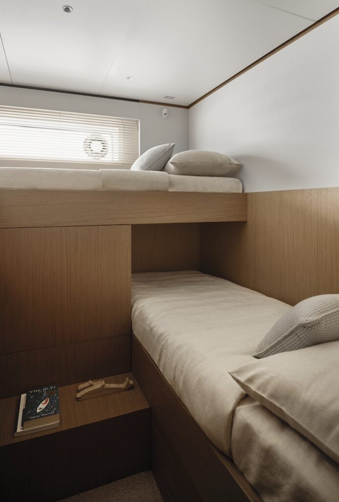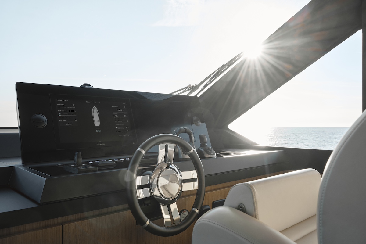 Combinando la autonomía y la velocidad de los motores tradicionales con transiciones fluidas, reducción del ruido y mayor comodidad del modo eléctrico, esta experiencia híbrida ofrece una navegación suave, un gran impulso eléctrico en la aceleración y una excelente respuesta de la transmisión. Un gran banco de baterías permite prescindir de la red eléctrica, algo que agradecerán tanto los propietarios como sus vecinos de amarre o en noches de fondeo, ya que las baterías se recargan durante la travesía o durante el atraque.