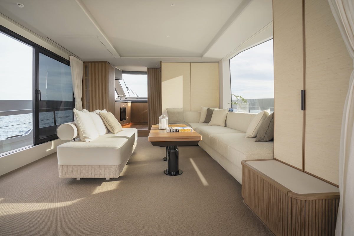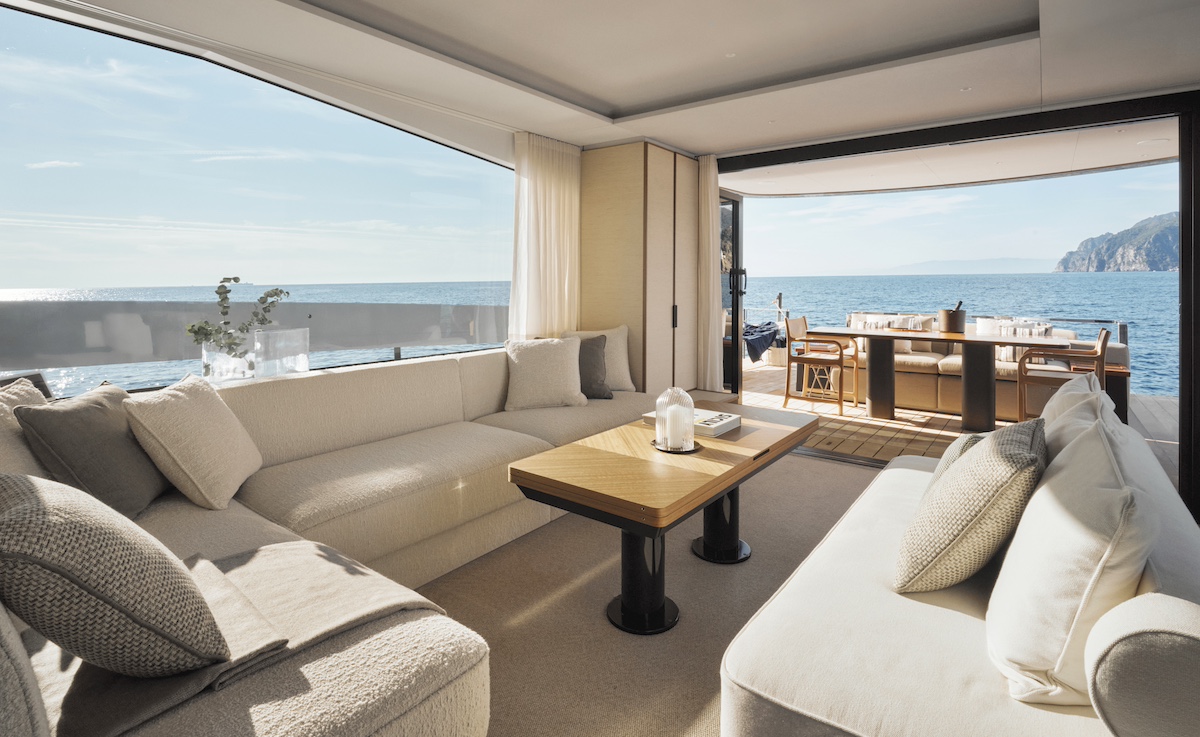 Con las grandes ventanas abiertas, el interior y el exterior se funden en un único entorno que rompen las barreras, no solo sociales sino físicas, típicas de otros modelos de concepto tradicional de la misma eslora.
