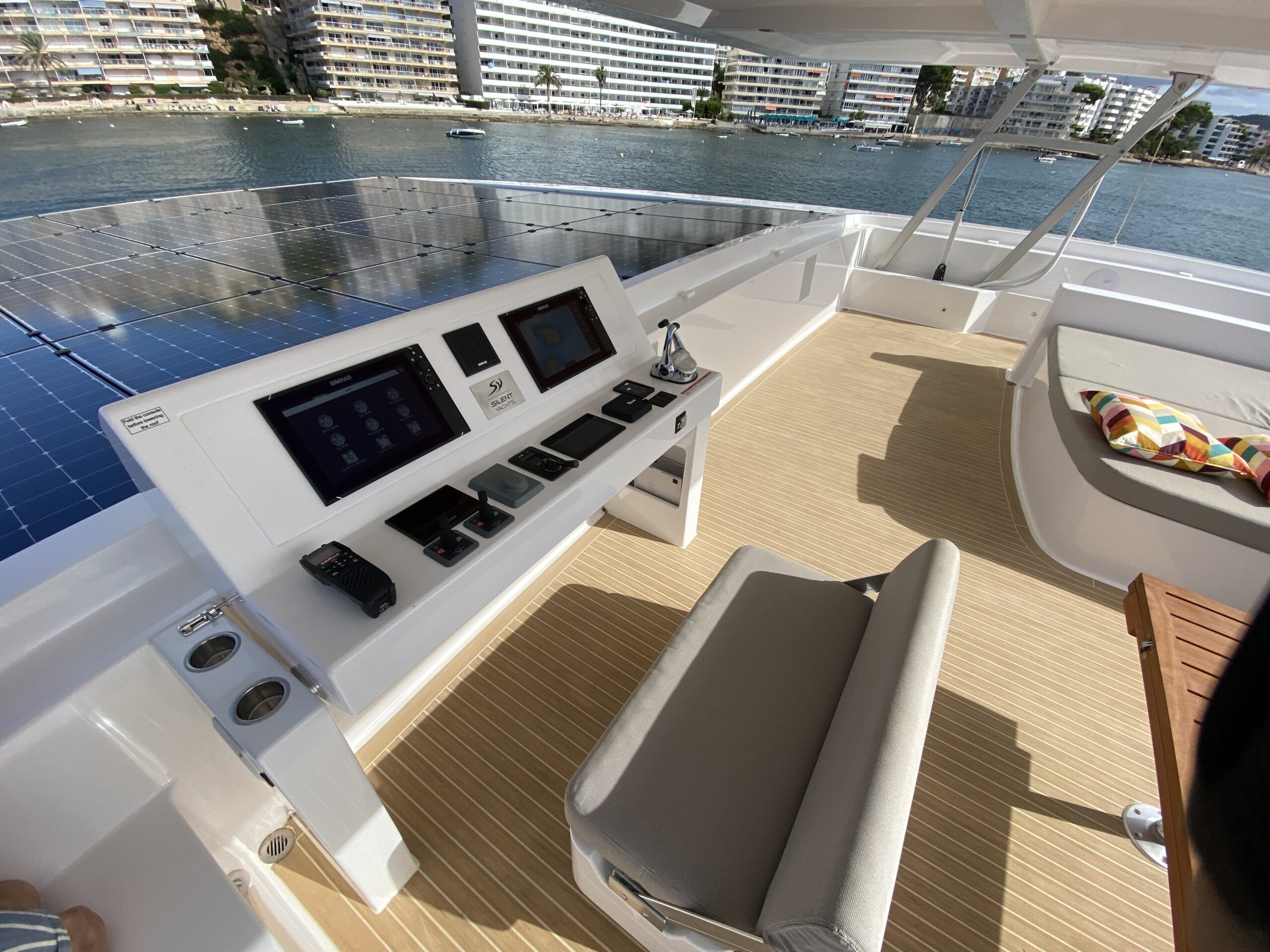 En este Silent, las pantallas dedicadas a los motores eléctricos y la grande multifunción de Simrad, ofrecen el estado de carga de las baterías, la autonomía restante, el consumo, y un sinfín de informaciones más que facilitan el control del barco en todo momento.