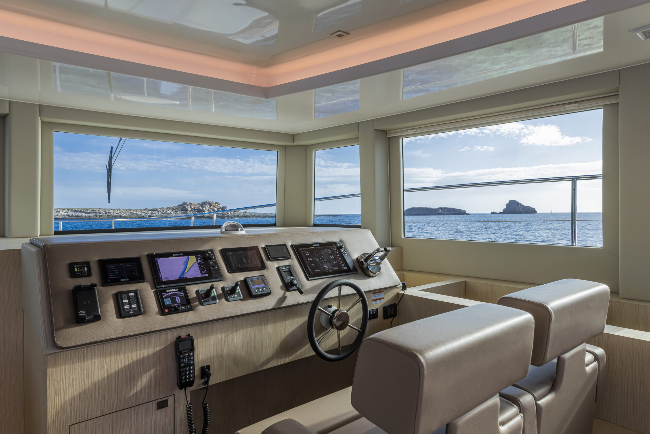 Ambos puestos de gobierno, el interior y el situado en flybridge presentan un completo equipamiento. Obviamente, el panel es muy similar al de un catamarán a motor ya que tanto pantallas, como radio, hélices de proa y demás instrumentación son comunes.