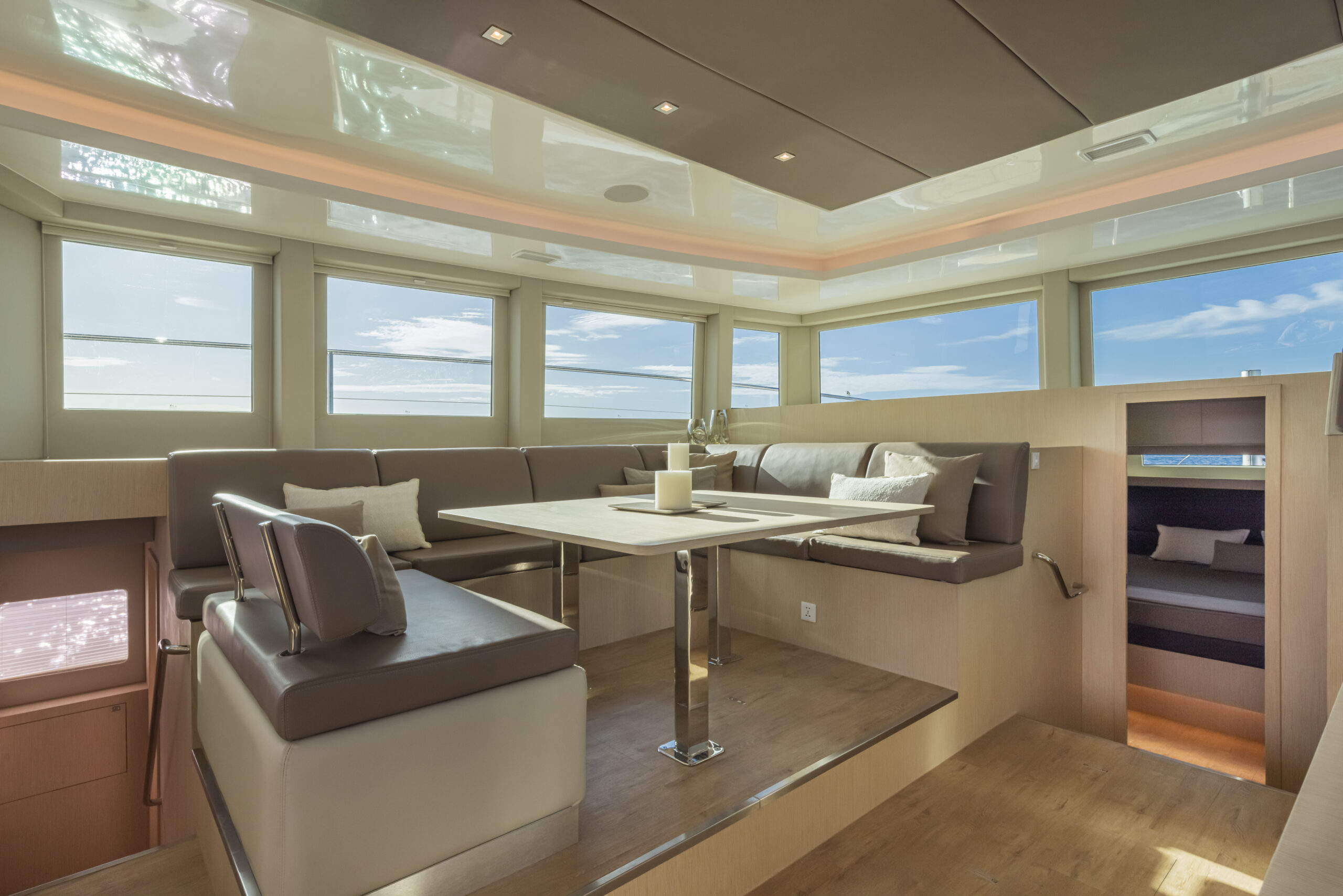 Un espacio impresionante con vista panorámica de 360 grados tal como es habitual en este tipo de catamaranes. No obstante, hemos de hacer una serie de apreciaciones que, además, el astillero conoce.