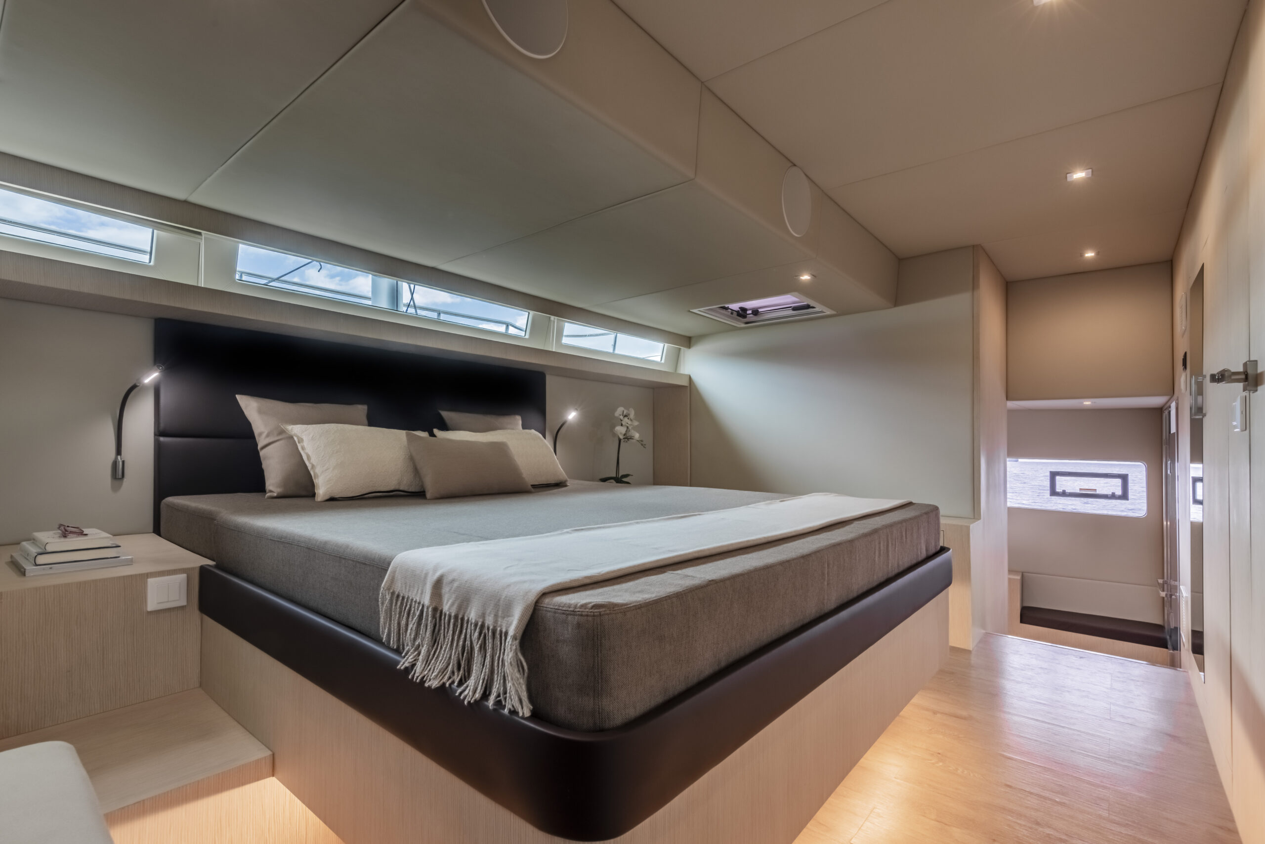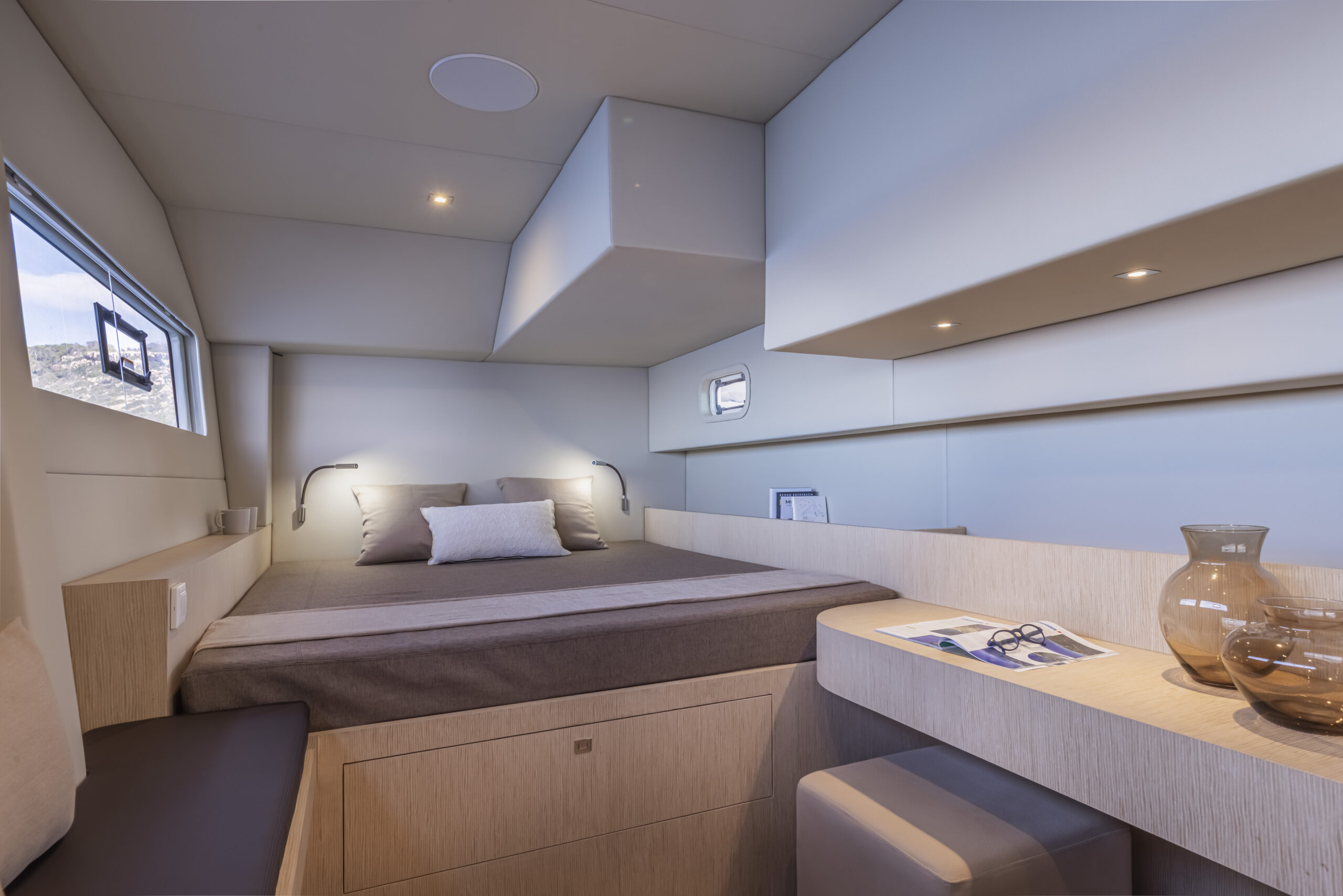 Como es natural en un catamarán de 60 pies el astillero brinda varias opciones de planta con cuatro o seis cabinas y diversas motorizaciones.