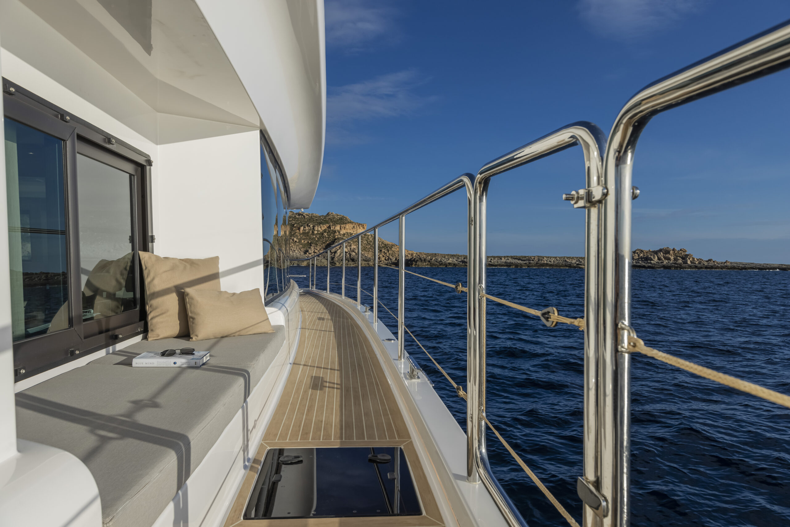 La cubierta de proa, totalmente despejada, está dotada de un enorme sofá en forma de U frente a dos robustas mesas que conforman una agradable dinete delante, quedando espacio para colocar dos hamacas si se desea.