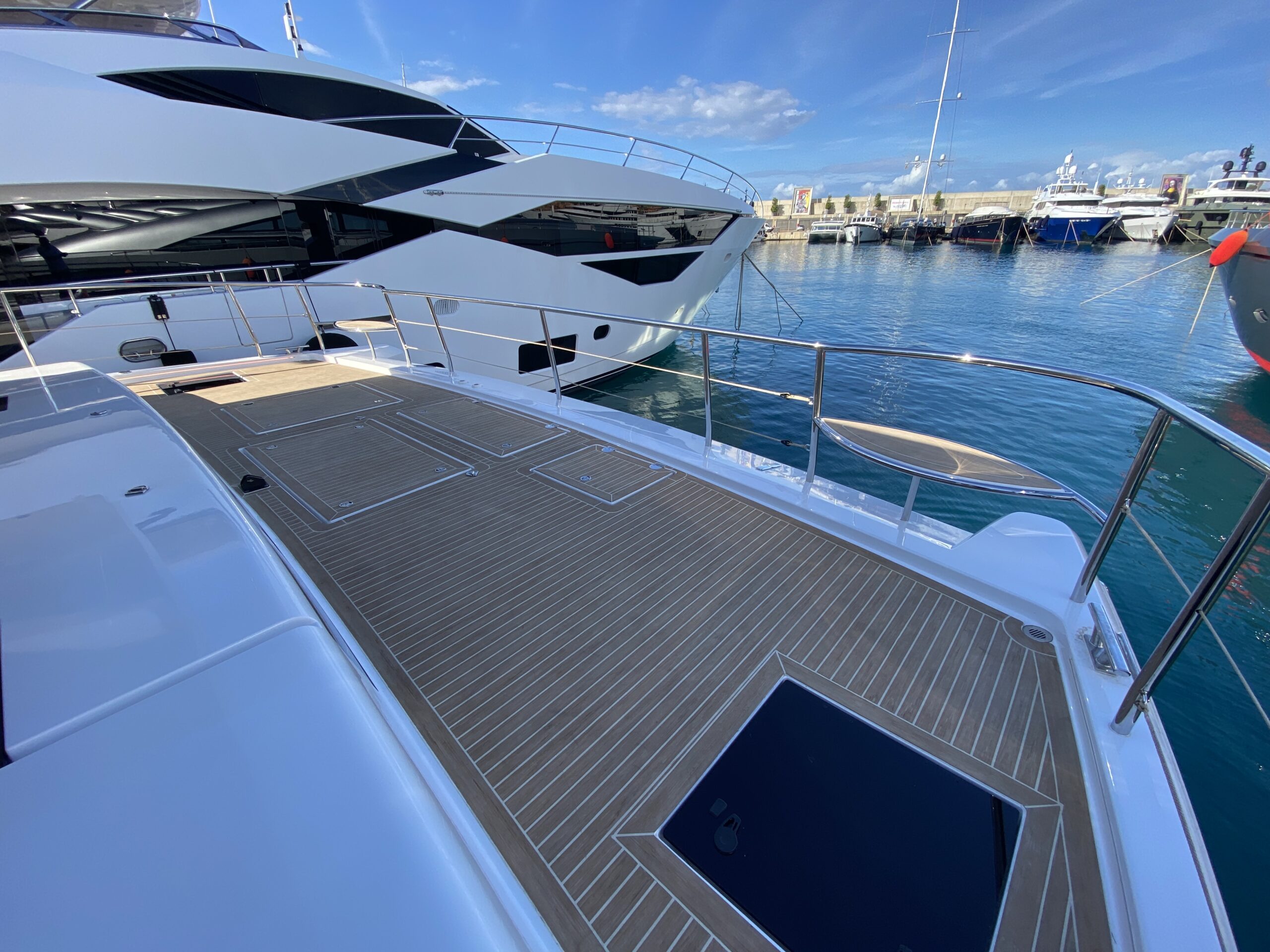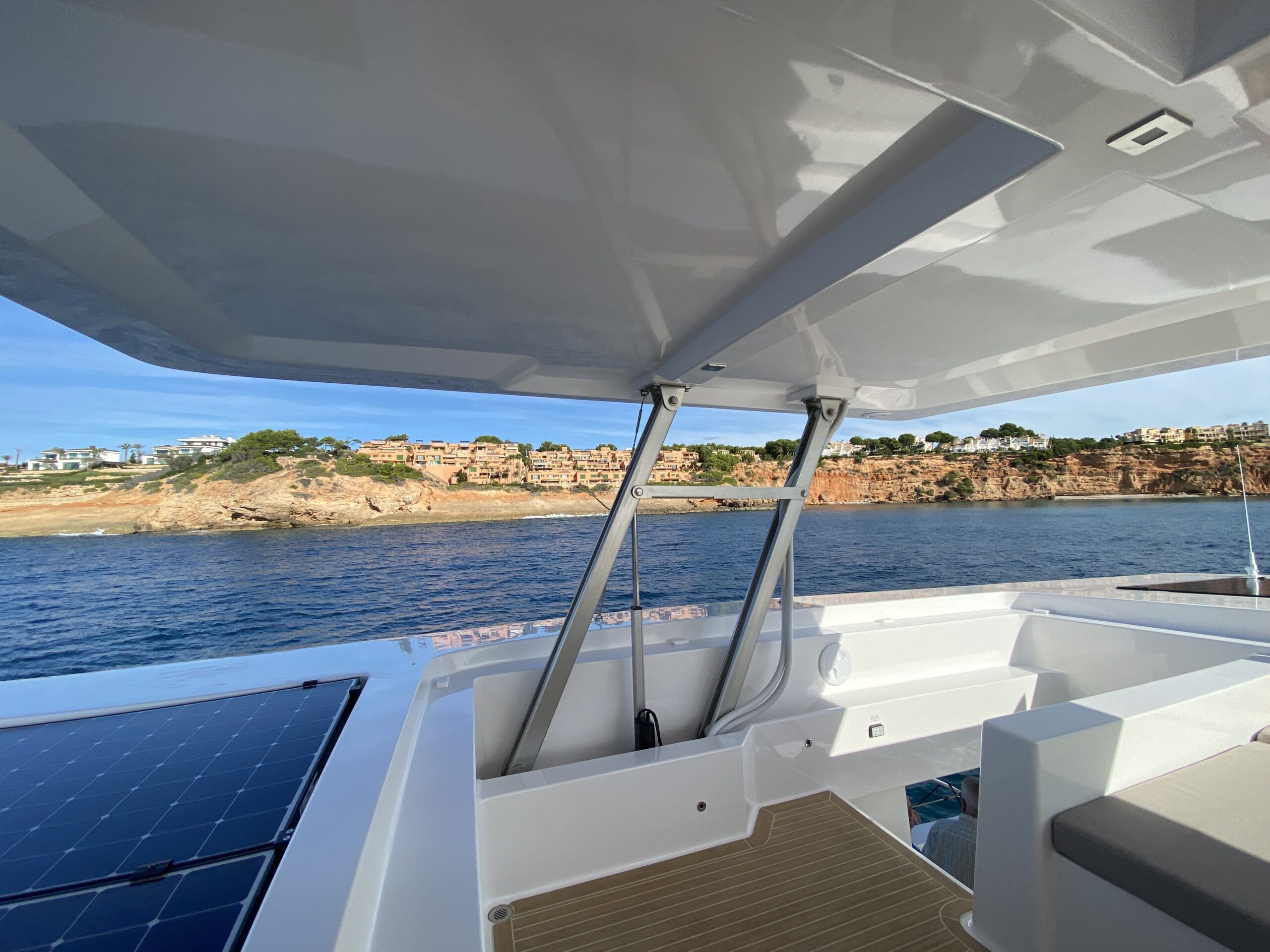Dos grandes sofás, el puesto de gobierno a babor, y una dinete detrás, configuran un fly que esconde una sorprendente particularidad. En efecto, el hard top, totalmente forrado de placas solares mediante un sistema automático se baja totalmente hasta cubrir toda la superficie del flybridge, al mismo nivel que las superficies de placas que cubren las partes delanteras y de popa del mismo flybridge. De este modo todo queda en un mismo plano y desaparece la zona habitable del fly.