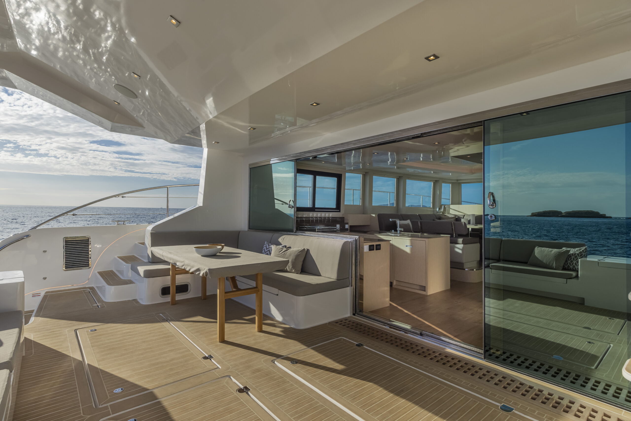 Sin embargo, lo más destacable en este catamarán es el flybridge, zona donde el astillero ha puesto el acento formando una sala de estar al aire libre. Este espacio no ocupa todo el techo de la cabina, ya que gran parte de proa y popa se destinan a placas solares.