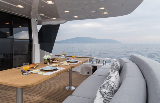 Destaca la piscina en proa con acceso directo desde la cabina del propietario, que puede substituirse por una zona de estar y comedor al aire libre. El flybridge está protegido por un techo rígido abrible y distribuye el segundo puesto de gobierno, una gran mesa para ocho, jacuzzi y zona de estar en popa con sofás y mesas a ambas bandas.