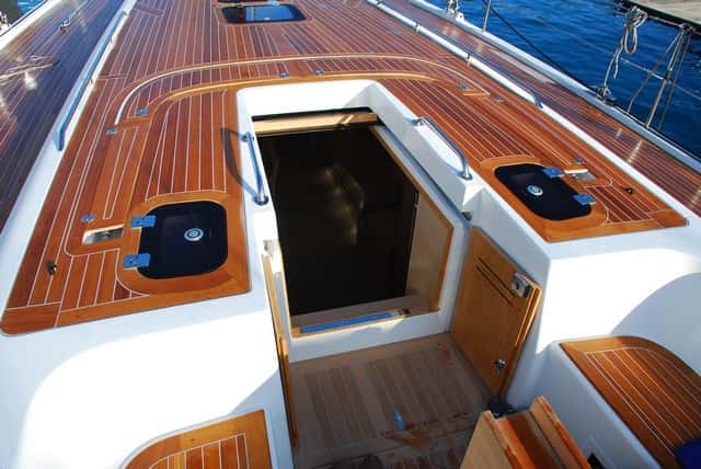 Desde la rueda, uno puede controlar absolutamente toda la maniobra desde los dos winches que se encuentran frente a cada uno de los pedestales. Hasta ellos llegan, ordenadamente y escamoteados bajo las brazolas, todas líneas. También la de escota de mayor, que se llevaba a estos winches reenviándola desde una polea doble anclada a un robusto cáncamo en el centro del plan por el interior de la botavara hacia proa y después de vuelta hasta ellos. Es decisión de cada patrón y de cada momento decidir qué cabo se lleva a qué winche, ya que ambos pueden usarse para todo. De hecho, el astillero no ofrece opción para un carro de escota de mayor, lo que deja bien clara la voluntad del diseñador de preservar la estética limpia de la cubierta y también el acierto del astillero al dirigir esta unidad hacia un destinatario muy concreto: el propietario que navegará generalmente con poca tripulación.