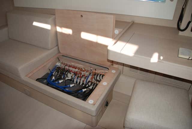 Los depósitos de agua están situados bajo los bancos del salón, pero uno de los cofres se reserva para un banco de baterías perfectamente accesible y bien organizado.