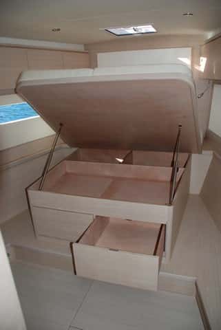 La cabina de proa no solo ofrece altura, volumen y espacio, sino una buena capacidad bajo la bien organizada cama doble central, dotada de cofres y cajones.