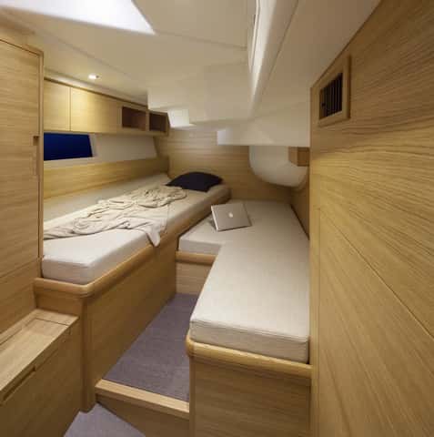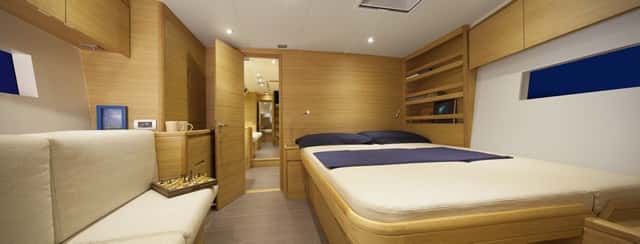 Para la cabina de proa, realmente espaciosa y bien equipada, el astillero propone dos opciones: con la cabecera de la cama en proa o con la cama a estribor y la cabecera adosada al mamparo principal. En ninguno de los casos se pierde estiba pero en la primera opción se sacrifica el doble sofá en la banda de estribor, para mantener la cama central exenta por ambos lados.