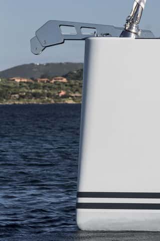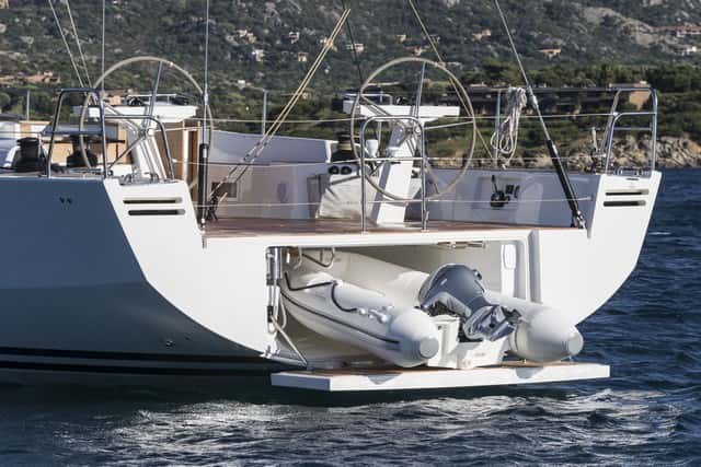 La popa totalmente abierta ofrece un excelente paso gracias a que el baquestay en pata de gallo hidráulico está anclado a las bandas, toda vez que el espejo, al abatirse, deja al descubierto el garaje del auxiliar, que se bota y se iza con pasmosa facilidad gracias a las guías con roldana y a un molinete de arrastre. En definitiva, una bañera espaciosa, limpia y bien organizada en la que una tripulación incluso numerosa se encontrará perfectamente a sus anchas.