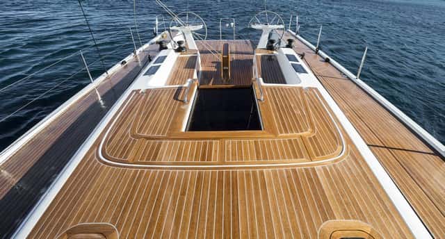 La carena creada por Javier Soto Acebal para el Solaris 58, con roda invertida, una generosa manga de cinco metros, secciones de popa generosas con ligera arista y una bañera abierta, ancha y capaz, es ya toda una declaración de intenciones. Si nos fijamos después en la cubierta, totalmente plana y despejada, con las escotillas enrasadas y el acastillaje y toda la cabullería de maniobra —incluida la de palo—escamoteada bajo la teca, sin piano de mordazas ni winches a los lados del tambucho, el objetivo del diseño cobra todo su sentido: se ha buscado, por encima de todo, la limpieza de formas para crear una cubierta plana y totalmente libre de obstáculos.